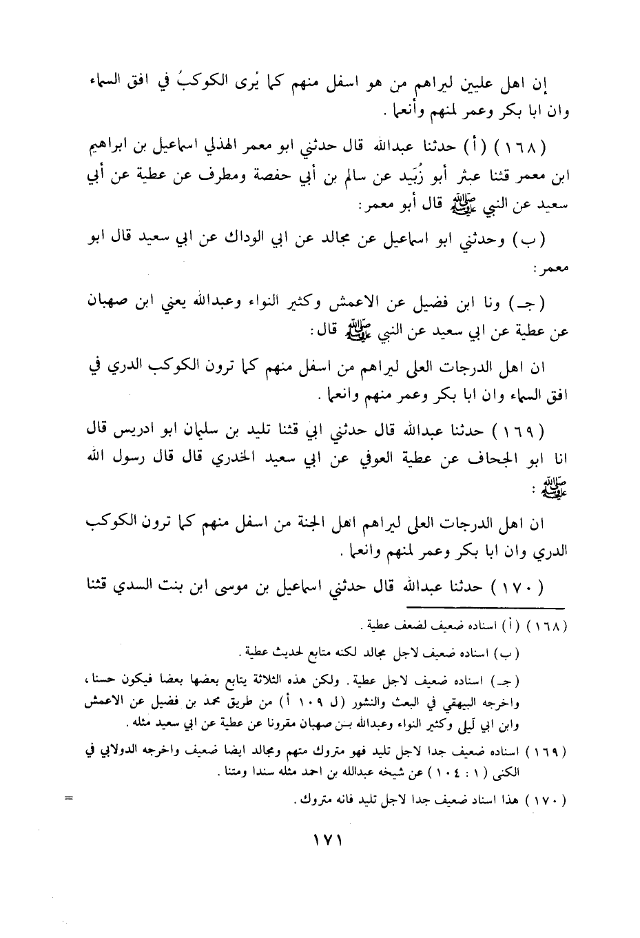 168 - حَدَّثَنَا عَبْدُ اللَّهِ قَالَ: حَدَّثَنِي أَبُو مَعْمَرٍ الْهُذَلِيُّ إِسْمَاعِيلُ بْنُ إِبْرَاهِيمَ بْنِ مَعْمَرٍ قثنا عَبْثَرٌ أَبُو زُبَيْدٍ، عَنْ سَالِمِ بْنِ أَبِي حَفْصَةَ، وَمُطَرِّفٍ، عَنْ عَطِيَّةَ، عَنْ أَبِي سَعِيدٍ، عَنِ النَّبِيِّ صَلَّى اللهُ عَلَيْهِ وَسَلَّمَ. قَالَ أَبُو مَعْمَرٍ: وَحَدَّثَنِي أَبُو إِسْمَاعِيلَ، عَنْ مُجَالِدٍ، عَنْ أَبِي الْوَدَّاكِ، عَنْ أَبِي سَعِيدٍ. قَالَ أَبُو مَعْمَرٍ: وَنا ابْنُ فُضَيْلٍ، عَنِ الْأَعْمَشِ، وَكَثِيرٍ النَّوَّاءِ، وَعَبْدِ اللَّهِ، يَعْنِي: ابْنَ صُهْبَانَ، عَنْ عَطِيَّةَ عَنْ أَبِي سَعِيدٍ، عَنِ النَّبِيِّ صَلَّى اللهُ عَلَيْهِ وَسَلَّمَ قَالَ: «إِنَّ §أَهْلَ الدَّرَجَاتِ الْعُلَى لَيَرَاهُمْ مَنْ أَسْفَلَ مِنْهُمْ كَمَا تَرَوْنَ الْكَوْكَبَ الدُّرِّيَّ فِي أُفُقِ السَّمَاءِ، وَإِنَّ أَبَا بَكْرٍ وَعُمَرَ مِنْهُمْ، وَأَنْعَمَا» .