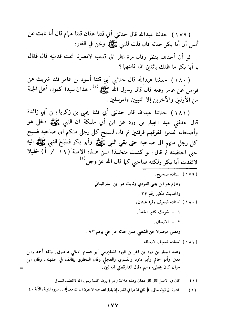 179 - حَدَّثَنَا عَبْدُ اللَّهِ قَالَ: حَدَّثَنِي أَبِي، قثنا عَفَّانُ قثنا هَمَّامٌ قَالَ: أنا ثَابِتٌ، عَنْ أَنَسٍ، أَنَّ أَبَا بَكْرٍ حَدَّثَهُ قَالَ: قُلْتُ لِلنَّبِيِّ صَلَّى اللهُ عَلَيْهِ وَسَلَّمَ وَنَحْنُ فِي الْغَارِ: لَوْ أَنَّ أَحَدَهُمْ يَنْظُرُ، وَقَالَ مَرَّةً: نَظَرَ، إِلَى قَدَمَيْهِ لَأَبْصَرَنَا تَحْتَ قَدَمَيْهِ؟ قَالَ: فَقَالَ: «يَا أَبَا بَكْرٍ، §مَا ظَنُّكَ بِاثْنَيْنِ اللَّهُ ثَالِثُهُمَا؟» .