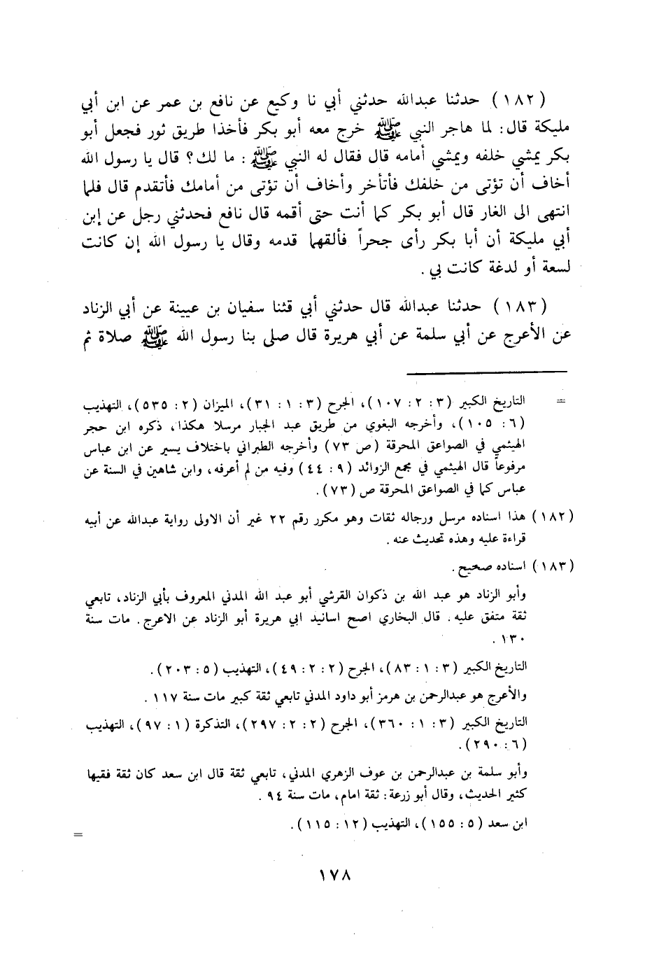 182 - حَدَّثَنَا عَبْدُ اللَّهِ قَالَ: حَدَّثَنِي أَبِي، نا وَكِيعٌ، عَنْ نَافِعِ بْنِ عُمَرَ، عَنِ ابْنِ أَبِي مُلَيْكَةَ قَالَ: لَمَّا هَاجَرَ النَّبِيُّ صَلَّى اللهُ عَلَيْهِ وَسَلَّمَ خَرَجَ مَعَهُ أَبُو بَكْرٍ، فَأَخَذَا طَرِيقَ ثَوْرٍ، فَجَعَلَ أَبُو بَكْرٍ يَمْشِي خَلْفَهُ وَيَمْشِي أَمَامَهُ قَالَ: فَقَالَ لَهُ النَّبِيُّ صَلَّى اللهُ عَلَيْهِ وَسَلَّمَ: «مَا لَكَ؟» قَالَ: يَا رَسُولَ اللَّهِ، §أَخَافُ أَنْ تُؤْتَى مِنْ خَلْفِكَ فَأَتَأَخَّرُ، وَأَخَافُ أَنْ تُؤْتَى مِنْ أَمَامِكَ فَأَتَقَدَّمُ، قَالَ: فَلَمَّا انْتَهَى إِلَى الْغَارِ قَالَ أَبُو بَكْرٍ: كَمَا أَنْتَ حَتَّى أَقُمَّهُ، قَالَ نَافِعٌ: فَحَدَّثَنِي رَجُلٌ عَنِ ابْنِ أَبِي مُلَيْكَةَ، أَنَّ أَبَا بَكْرٍ رَأَى جُحْرًا فَأَلْقَمَهَا قَدَمَهُ وَقَالَ: يَا رَسُولَ اللَّهِ، إِنْ كَانَتْ لَسْعَةٌ أَوْ لَدْغَةٌ كَانَتْ بِي.