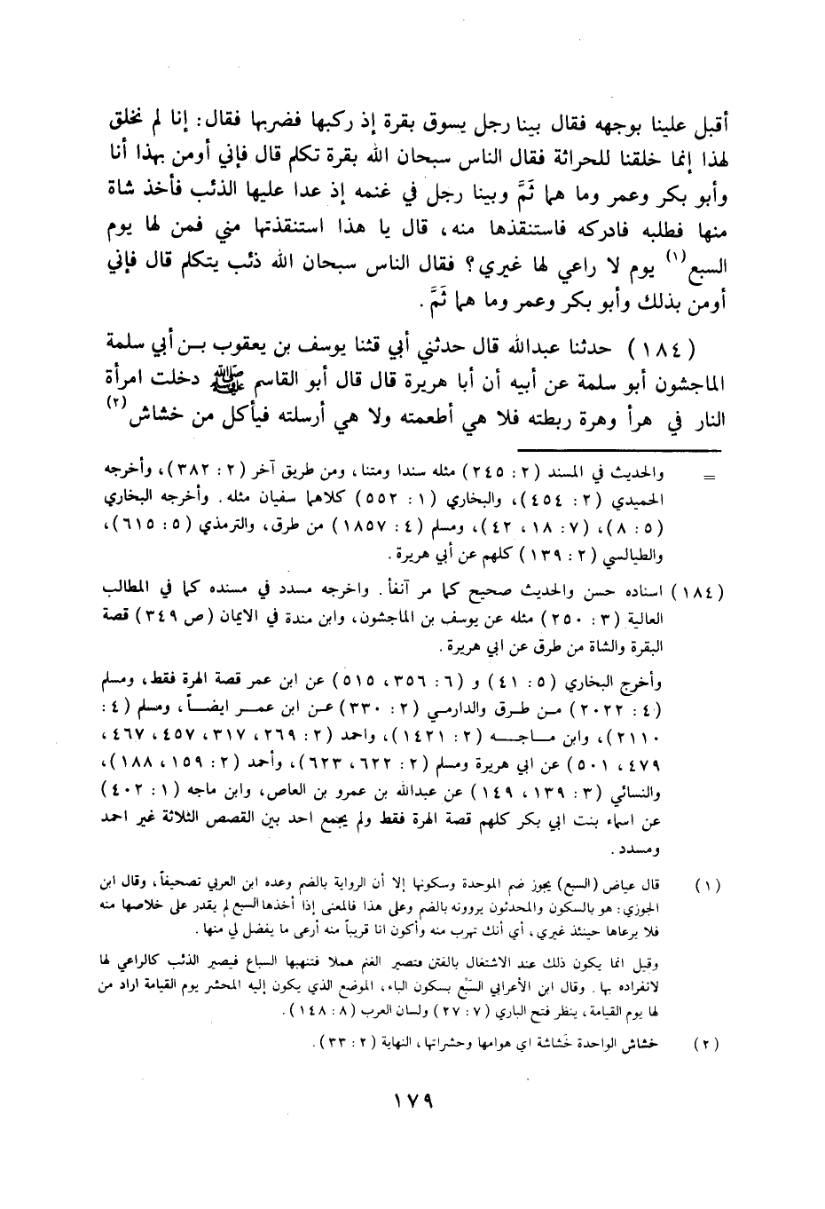 184 - حَدَّثَنَا عَبْدُ اللَّهِ قَالَ: حَدَّثَنِي أَبِي، قثنا يُوسُفُ بْنُ يَعْقُوبَ بْنِ أَبِي سَلَمَةَ الْمَاجِشُونُ أَبُو سَلَمَةَ، عَنْ أَبِيهِ، أَنَّ أَبَا هُرَيْرَةَ قَالَ: قَالَ أَبُو الْقَاسِمِ صَلَّى اللهُ عَلَيْهِ وَسَلَّمَ: " §دَخَلَتِ امْرَأَةٌ النَّارَ فِي هِرٍّ أَوْ هِرَّةٍ، رَبَطَتْهُ فَلَا هِيَ أَطْعَمَتْهُ، وَلَا هِيَ أَرْسَلَتْهُ فَيَأْكُلُ مِنْ خَشَاشِ الْأَرْضِ، ثُمَّ مَاتَ وَشَهِدَ عَلَى ذَلِكَ أَبُو بَكْرٍ وَعُمَرُ، وَلَيْسَ ثَمَّ أَبُو بَكْرٍ وَلَا عُمَرُ، وَبَيْنَا رَجُلٌ رَاكِبٌ بَقَرَةً فَالْتَفَتَتْ إِلَيْهِ فَقَالَتْ: إِنِّي لَسْتُ لِهَذَا خُلِقْتُ إِنَّمَا خُلِقْتُ لِلْحَرْثِ، وَيَشْهَدُ عَلَى ذَلِكَ أَبُو بَكْرٍ وَعُمَرُ، وَلَيْسَ ثَمَّ أَبُو بَكْرٍ وَلَا عُمَرُ، وَبَيْنَا رَجُلٌ فِي غَنَمِهِ جَاءَ الذِّئْبُ فَأَخَذَ شَاةً مِنْهَا، فَأَدْرَكَهُ الرَّجُلُ فَنَزَعَهَا مِنْهُ، وَالْتَفَتَ إِلَيْهِ الذِّئْبُ فَقَالَ: يَا هَذَا، نَزَعْتَهَا مِنِّي الْيَوْمَ، فَمَنْ لَهَا يَوْمَ السَّبُعِ يَوْمَ لَا رَاعِيَ لَهَا غَيْرِي؟ وَيَشْهَدُ عَلَى ذَلِكَ أَبُو بَكْرٍ وَعُمَرُ، وَلَيْسَ ثَمَّ أَبُو بَكْرٍ وَلَا عُمَرُ ".