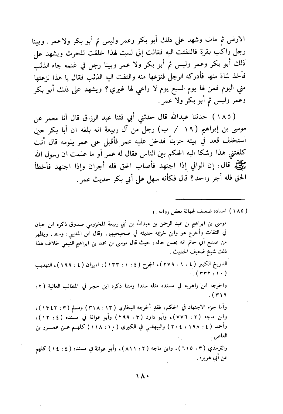 185 - حَدَّثَنَا عَبْدُ اللَّهِ قَالَ: حَدَّثَنِي أَبِي، قثنا عَبْدُ الرَّزَّاقِ قَالَ: أنا مَعْمَرٌ، عَنْ مُوسَى بْنِ إِبْرَاهِيمَ، رَجُلٌ مِنْ آلِ رَبِيعَةَ، أَنَّهُ بَلَغَهُ أَنَّ أَبَا بَكْرٍ حِينَ اسْتُخْلِفَ قَعَدَ فِي بَيْتِهِ حَزِينًا، فَدَخَلَ عَلَيْهِ عُمَرُ، فَأَقْبَلَ عَلَى عُمَرَ يَلُومُهُ قَالَ: أَنْتَ كَلَّفْتَنِي هَذَا، وَشَكَا إِلَيْهِ الْحُكْمَ بَيْنَ النَّاسِ، فَقَالَ لَهُ عُمَرُ: أَوَمَا عَلِمْتَ أَنَّ رَسُولَ اللَّهِ صَلَّى اللهُ عَلَيْهِ وَسَلَّمَ قَالَ: «§إِنَّ الْوَالِيَ إِذَا اجْتَهَدَ فَأَصَابَ الْحَقَّ فَلَهُ أَجْرَانِ، وَإِذَا اجْتَهَدَ فَأَخْطَأَ الْحَقَّ فَلَهُ أَجْرٌ وَاحِدٌ؟» قَالَ: فَكَأَنَّهُ سَهَّلَ عَلَى أَبِي بَكْرٍ حَدِيثُ عُمَرَ.