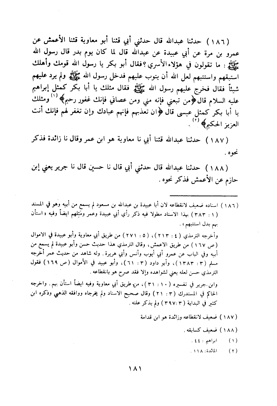 186 - حَدَّثَنَا عَبْدُ اللَّهِ قَالَ: حَدَّثَنِي أَبِي، قثنا أَبُو مُعَاوِيَةَ قثنا الْأَعْمَشُ، عَنْ عَمْرِو بْنِ مُرَّةَ، عَنْ أَبِي عُبَيْدَةَ، عَنْ عَبْدِ اللَّهِ قَالَ: لَمَّا كَانَ يَوْمُ بَدْرٍ قَالَ رَسُولُ اللَّهِ صَلَّى اللهُ عَلَيْهِ وَسَلَّمَ: «§مَا تَقُولُونَ فِي هَؤُلَاءِ الْأَسْرَى؟» فَقَالَ أَبُو بَكْرٍ: يَا رَسُولَ اللَّهِ، قَوْمُكَ وَأَهْلُكَ اسْتَبْقِهِمْ وَاسْتَتِبْهُمْ لَعَلَّ اللَّهَ أَنْ يَتُوبَ عَلَيْهِمْ، فَدَخَلَ رَسُولُ اللَّهِ صَلَّى اللهُ عَلَيْهِ وَسَلَّمَ وَلَمْ يَرُدَّ عَلَيْهِمْ شَيْئًا، فَقَالَ: فَخَرَجَ عَلَيْهِمْ رَسُولُ اللَّهِ صَلَّى اللهُ عَلَيْهِ وَسَلَّمَ فَقَالَ: " مَثَلُكَ يَا أَبَا بَكْرٍ كَمَثَلِ إِبْرَاهِيمَ عَلَيْهِ السَّلَامُ قَالَ: {فَمَنْ تَبِعَنِي فَإِنَّهُ مِنِّي وَمَنْ عَصَانِي فَإِنَّكَ غَفُورٌ رَحِيمٌ} [إبراهيم: 36] ، وَمَثَلُكَ يَا أَبَا بَكْرٍ كَمَثَلِ عِيسَى قَالَ: {إِنْ تُعَذِّبْهُمْ فَإِنَّهُمْ عِبَادُكَ وَإِنْ تَغْفِرْ لَهُمْ فَإِنَّكَ أَنْتَ الْعَزِيزُ الْحَكِيمُ} [المائدة: 118] ".