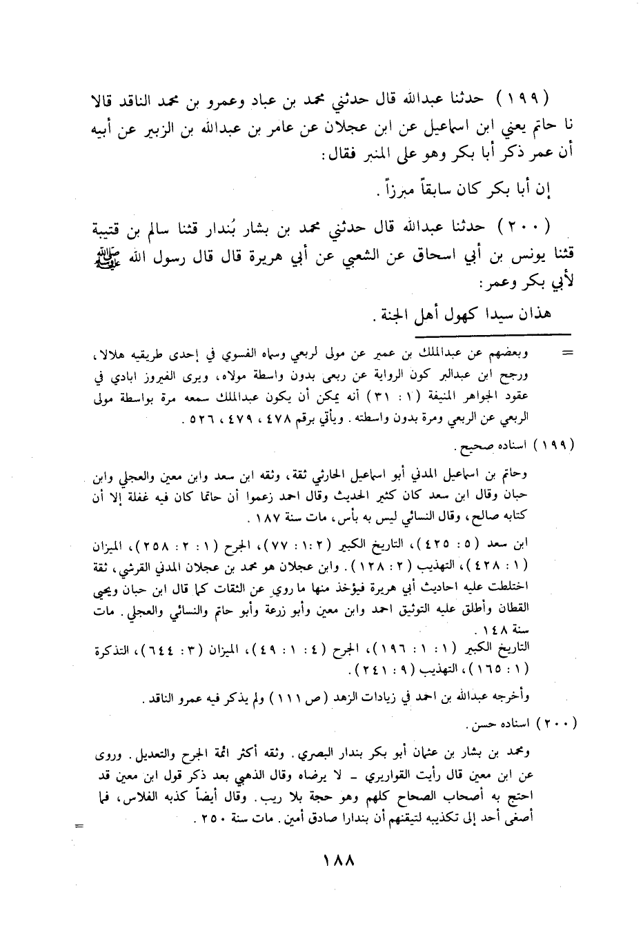 200 - حَدَّثَنَا عَبْدُ اللَّهِ قَالَ: حَدَّثَنِي مُحَمَّدُ بْنُ بَشَّارٍ بُنْدَارٌ قثنا سَالِمُ بْنُ قُتَيْبَةَ قثنا يُونُسُ بْنُ أَبِي إِسْحَاقَ، عَنِ الشَّعْبِيِّ، عَنْ أَبِي هُرَيْرَةَ قَالَ: قَالَ رَسُولُ اللَّهِ صَلَّى اللهُ عَلَيْهِ وَسَلَّمَ لِأَبِي بَكْرٍ وَعُمَرَ: «§هَذَانِ سَيِّدَا كُهُولِ أَهْلِ الْجَنَّةِ» .