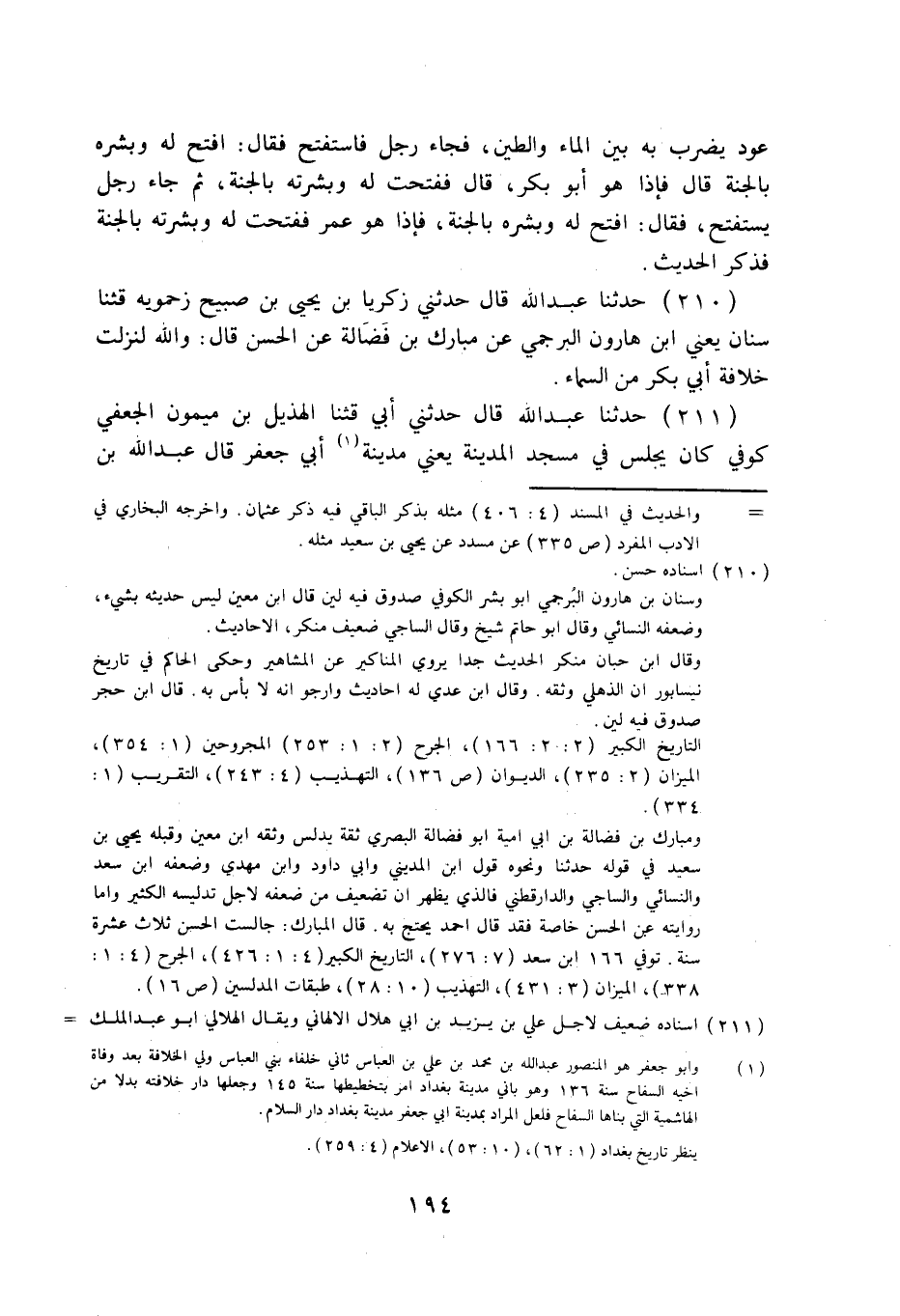 210 - حَدَّثَنَا عَبْدُ اللَّهِ قَالَ: حَدَّثَنِي زَكَرِيَّا بْنُ يَحْيَى بْنِ صَبِيحٍ زَحْمَوَيْهِ قثنا سِنَانٌ، يَعْنِي: ابْنَ هَارُونَ الْبُرْجُمِيُّ، عَنْ مُبَارَكِ بْنِ فَضَالَةَ، عَنِ الْحَسَنِ قَالَ: §وَاللَّهِ لَنَزَلَتْ خِلَافَةُ أَبِي بَكْرٍ مِنَ السَّمَاءِ.