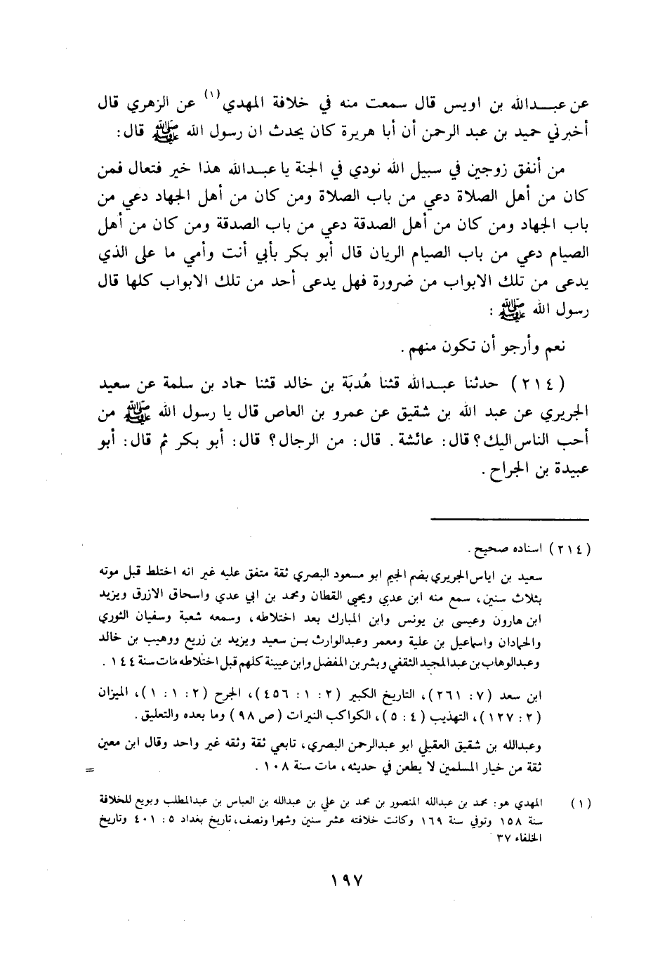 214 - حَدَّثَنَا عَبْدُ اللَّهِ قثنا هُدْبَةُ بْنُ خَالِدٍ قثنا حَمَّادُ بْنُ سَلَمَةَ، عَنْ سَعِيدٍ الْجُرَيْرِيِّ، عَنْ عَبْدِ اللَّهِ بْنِ شَقِيقٍ، عَنْ عَمْرِو بْنِ الْعَاصِ قَالَ: يَا رَسُولَ اللَّهِ، §مَنْ أَحَبُّ النَّاسِ إِلَيْكَ؟ قَالَ: «عَائِشَةُ» ، قَالَ: مِنَ الرِّجَالِ؟ قَالَ: «أَبُو بَكْرٍ» ، ثُمَّ قَالَ: «أَبُو عُبَيْدَةَ بْنُ الْجَرَّاحِ» .