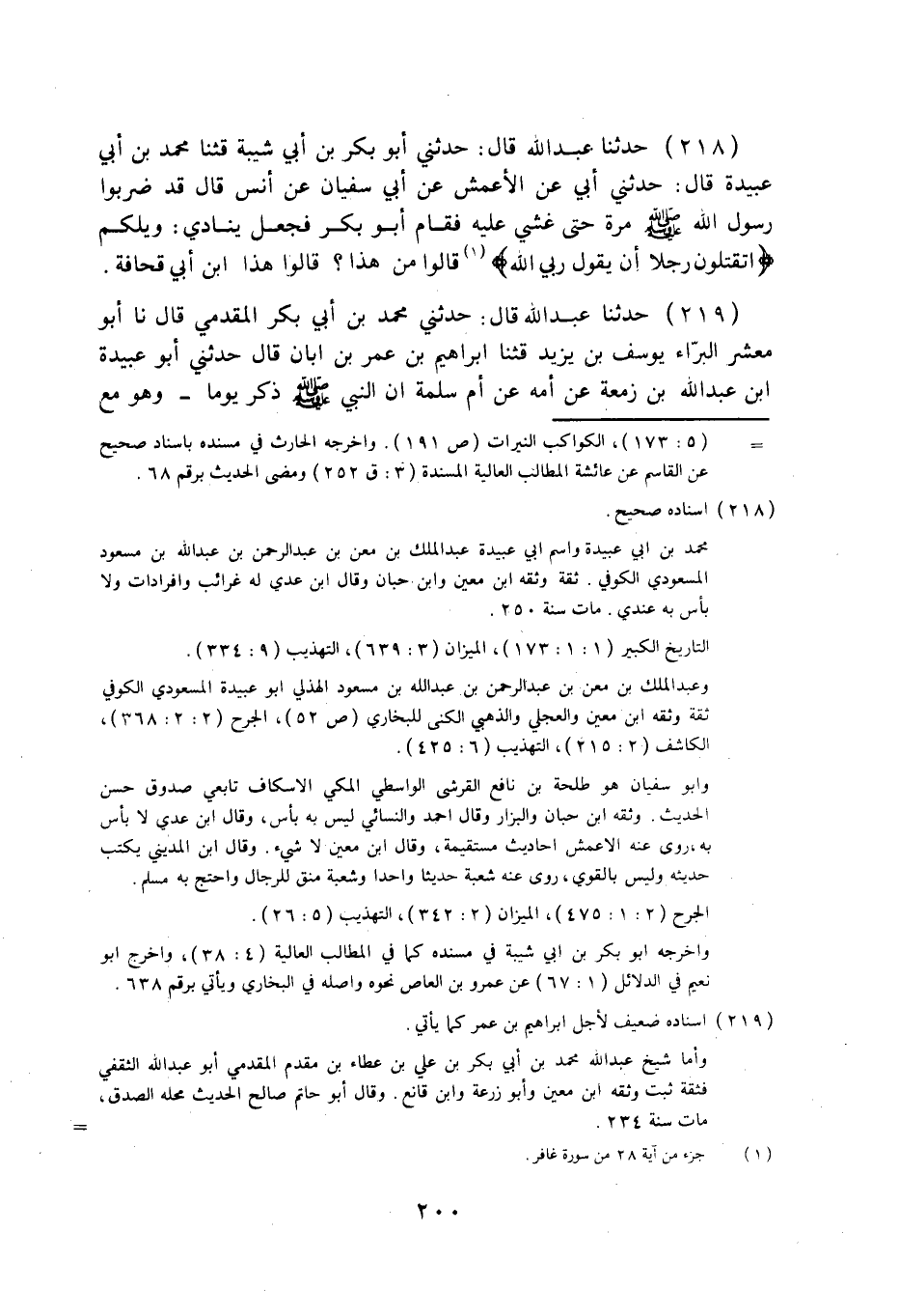 218 - حَدَّثَنَا عَبْدُ اللَّهِ قَالَ: حَدَّثَنِي أَبُو بَكْرِ بْنُ أَبِي شَيْبَةَ قثنا مُحَمَّدُ بْنُ أَبِي عُبَيْدَةَ قَالَ: حَدَّثَنِي أَبِي، عَنِ الْأَعْمَشِ، عَنْ أَبِي سُفْيَانَ، عَنْ أَنَسٍ قَالَ: قَدْ ضَرَبُوا رَسُولَ اللَّهِ صَلَّى اللهُ عَلَيْهِ وَسَلَّمَ مَرَّةً حَتَّى غُشِيَ عَلَيْهِ، فَقَامَ أَبُو بَكْرٍ فَجَعَلَ يُنَادِي: §وَيْلَكُمْ {أَتَقْتُلُونَ رَجُلًا أَنْ يَقُولُ رَبِّيَ اللَّهُ} [غافر: 28] ؟ قَالُوا: مَنْ هَذَا؟ قَالُوا: هَذَا ابْنُ أَبِي قُحَافَةَ.