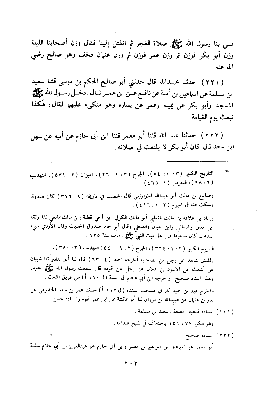 222 - حَدَّثَنَا عَبْدُ اللَّهِ قثنا أَبُو مَعْمَرٍ قثنا ابْنُ أَبِي حَازِمٍ، عَنْ أَبِيهِ، عَنْ سَهْلِ بْنِ سَعْدٍ قَالَ: §كَانَ أَبُو بَكْرٍ لَا يَلْتَفِتُ فِي صَلَاتِهِ.