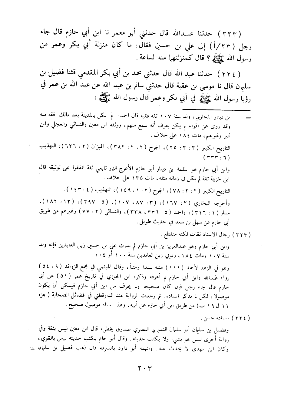 223 - حَدَّثَنَا عَبْدُ اللَّهِ قَالَ: حَدَّثَنِي أَبُو مَعْمَرٍ، نا ابْنُ أَبِي حَازِمٍ قَالَ: جَاءَ رَجُلٌ إِلَى عَلِيِّ بْنِ حُسَيْنٍ فَقَالَ: §مَا كَانَ مَنْزِلَةُ أَبِي بَكْرٍ وَعُمَرَ مِنْ رَسُولِ اللَّهِ صَلَّى اللهُ عَلَيْهِ وَسَلَّمَ؟ قَالَ: كَمَنْزِلَتِهِمَا مِنْهُ السَّاعَةَ.