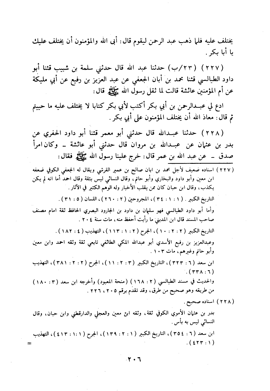 227 - حَدَّثَنَا عَبْدُ اللَّهِ قَالَ: حَدَّثَنِي سَلَمَةُ بْنُ شَبِيبٍ قثنا أَبُو دَاوُدَ الطَّيَالِسِيُّ قثنا مُحَمَّدُ بْنُ أَبَانَ الْجُعْفِيُّ، عَنْ عَبْدِ اللَّهِ بْنِ عَبْدِ الْعَزِيزِ بْنِ رُفَيْعٍ، عَنِ ابْنِ أَبِي مُلَيْكَةَ، عَنْ أُمِّ الْمُؤْمِنِينَ عَائِشَةَ قَالَتْ: لَمَّا ثَقُلَ رَسُولُ اللَّهِ صَلَّى اللهُ عَلَيْهِ وَسَلَّمَ قَالَ: «ادْعُ لِي عَبْدَ الرَّحْمَنِ بْنَ أَبِي بَكْرٍ أَكْتُبْ لِأَبِي بَكْرٍ كِتَابًا لَا يُخْتَلَفُ عَلَيْهِ مَا حَيِيتُمْ» ، ثُمَّ قَالَ: §مَعَاذَ اللَّهِ أَنْ يَخْتَلِفَ الْمُؤْمِنُونَ عَلَى أَبِي بَكْرٍ ".