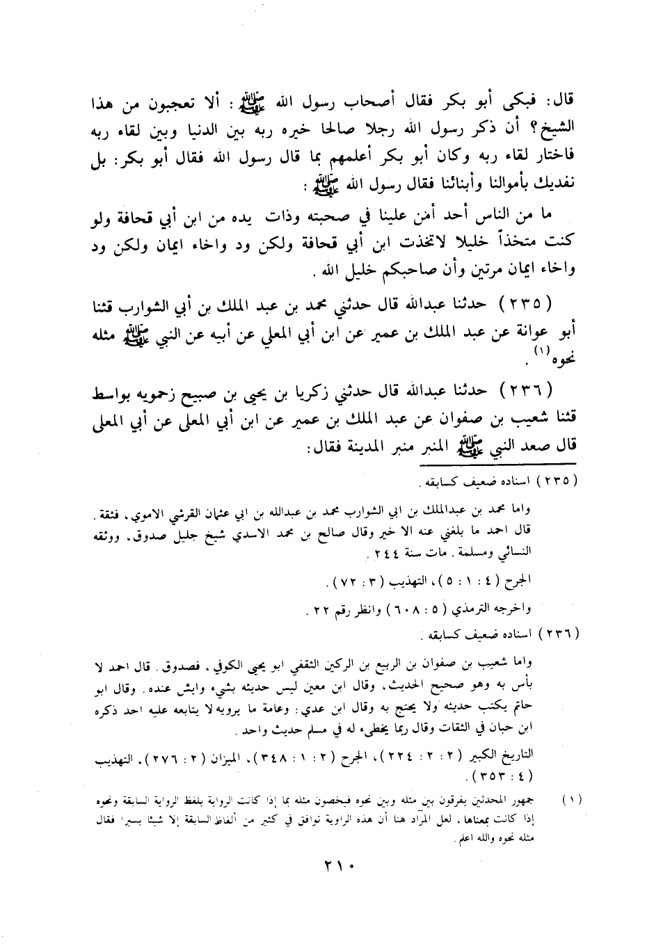 236 - حَدَّثَنَا عَبْدُ اللَّهِ قَالَ: حَدَّثَنِي زَكَرِيَّا بْنُ يَحْيَى بْنِ صَبِيحٍ زَحْمَوَيْهِ بِوَاسِطَ قثنا شُعَيْبُ بْنُ صَفْوَانَ، عَنْ عَبْدِ الْمَلِكِ بْنِ عُمَيْرٍ، عَنِ ابْنِ أَبِي الْمُعَلَّى، عَنْ أَبِي الْمُعَلَّى قَالَ: صَعِدَ النَّبِيُّ صَلَّى اللهُ عَلَيْهِ وَسَلَّمَ الْمِنْبَرَ مِنْبَرَ الْمَدِينَةِ فَقَالَ: «§إِنَّ رِجْلَيَّ عَلَى تُرْعَةٍ مِنْ تُرَعِ الْحَوْضِ» ، قَالَ: وَأَصْحَابُ النَّبِيِّ صَلَّى اللهُ عَلَيْهِ وَسَلَّمَ تَحْتَ الْمِنْبَرِ مُتَوَافِرُونَ، وَأَبُو بَكْرٍ مُتَقَنِّعٌ فِي الْقَوْمِ، فَقَالَ رَسُولُ اللَّهِ صَلَّى اللهُ عَلَيْهِ وَسَلَّمَ: «إِنَّ عَبْدًا مِنْ عَبِيدِ اللَّهِ خَيَّرَهُ رَبُّهُ بَيْنَ أَنْ يَعِيشَ فِي الدُّنْيَا مَا شَاءَ أَنْ يَعِيشَ فِيهَا، وَأَنْ يَأْكُلَ مِنَ الدُّنْيَا مَا شَاءَ أَنْ يَأْكُلَ مِنْهَا، وَبَيْنَ لِقَاءِ رَبِّهِ» ، فَلَمْ يَفْطِنْ أَحَدٌ مِنَ الْقَوْمِ لِمَا قَالَ النَّبِيُّ صَلَّى اللهُ عَلَيْهِ وَسَلَّمَ غَيْرَ أَبِي بَكْرٍ، فَانْتَحَبَ بَاكِيًا، فَقَالَ الْقَوْمُ: انْظُرُوا إِلَى هَذَا الشَّيْخِ مَا يُبْكِيهِ؟ إِنَّ رَسُولَ اللَّهِ قَالَ: «إِنَّ عَبْدًا مِنْ عَبِيدِ اللَّهِ خَيَّرَهُ رَبُّهُ بَيْنَ أَنْ يَعِيشَ فِي الدُّنْيَا مَا شَاءَ أَنْ يَعِيشَ فِيهَا، وَأَنْ يَأْكُلَ مِنَ الدُّنْيَا مَا شَاءَ أَنْ يَأْكُلَ مِنْهَا، وَبَيْنَ لِقَاءِ رَبِّهِ، فَاخْتَارَ الْعَبْدُ لِقَاءَ رَبِّهِ» ، فَمَا يُبْكِي هَذَا الشَّيْخَ؟ فَلَمَّا سَمِعَ مَقَالَتَهُمْ رَفَعَ رَأْسَهُ إِلَى النَّبِيِّ صَلَّى اللهُ عَلَيْهِ وَسَلَّمَ فَقَالَ: بَلْ نَفْدِيكَ بِآبَائِنَا وَأَمْوَالِنَا، فَقَالَ رَسُولُ اللَّهِ صَلَّى اللهُ عَلَيْهِ وَسَلَّمَ: «مَا أَحَدٌ مِنَ النَّاسِ أَمَنَّ فِي صُحْبَتِهِ، وَلَا فِي ذَاتِ يَدِهِ، مِنِ ابْنِ أَبِي قُحَافَةَ، وَلَوْ كُنْتُ مُتَّخِذًا خَلِيلًا لَاتَّخَذْتُ ابْنَ أَبِي قُحَافَةَ، وَلَكِنْ وُدٌّ وَإِخَاءٌ وَإِيمَانٌ، وَإِنَّ صَاحِبَكُمْ خَلِيلُ اللَّهِ» .