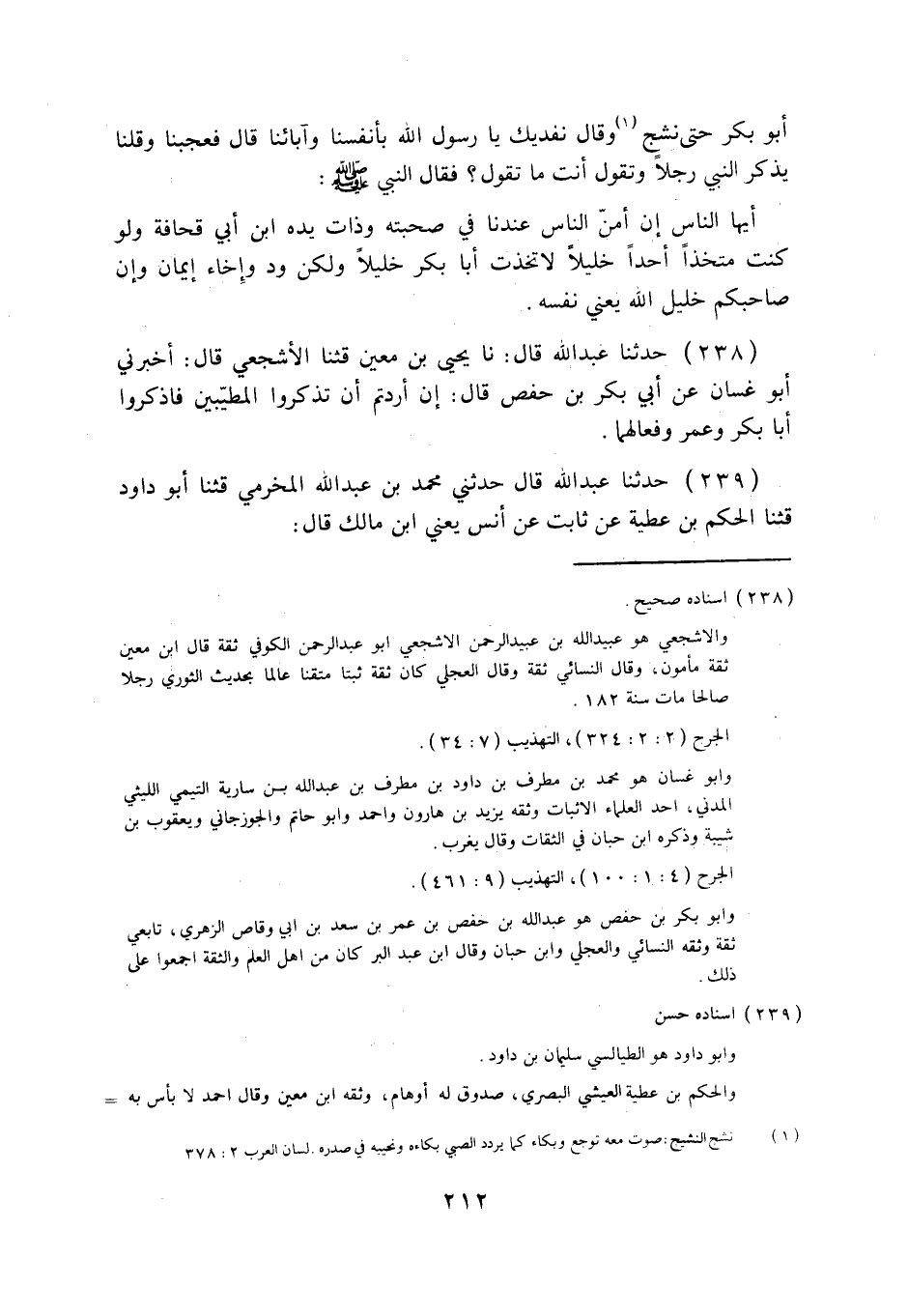 239 - حَدَّثَنَا عَبْدُ اللَّهِ قَالَ: حَدَّثَنِي مُحَمَّدُ بْنُ عَبْدِ اللَّهِ الْمُخَرِّمِيُّ قثنا أَبُو دَاوُدَ قثنا الْحَكَمُ بْنُ عَطِيَّةَ، عَنْ ثَابِتٍ، عَنْ أَنَسٍ، يَعْنِي: ابْنَ مَالِكٍ، قَالَ: كَانَ النَّبِيُّ صَلَّى اللهُ عَلَيْهِ وَسَلَّمَ §يَخْرُجُ وَالْمُهَاجِرُونَ وَالْأَنْصَارُ جُلُوسٌ، مَا فِيهِمْ أَحَدٌ يَرْفَعُ رَأْسَهُ مِنْ حَبْوَتِهِ إِلَّا أَبُو بَكْرٍ وَعُمَرُ، فَإِنَّهُ يَبْتَسِمُ إِلَيْهِمَا وَيَبْتَسِمَانِ إِلَيْهِ ". قَالَ أَبُو جَعْفَرٍ مُحَمَّدُ بْنُ عَبْدِ اللَّهِ الْمُخَرِّمِيُّ: وَكَانَ عَبْدُ الرَّحْمَنِ بْنُ مَهْدِيٍّ مُعْجَبًا بِالْحَكَمِ بْنِ عَطِيَّةَ.