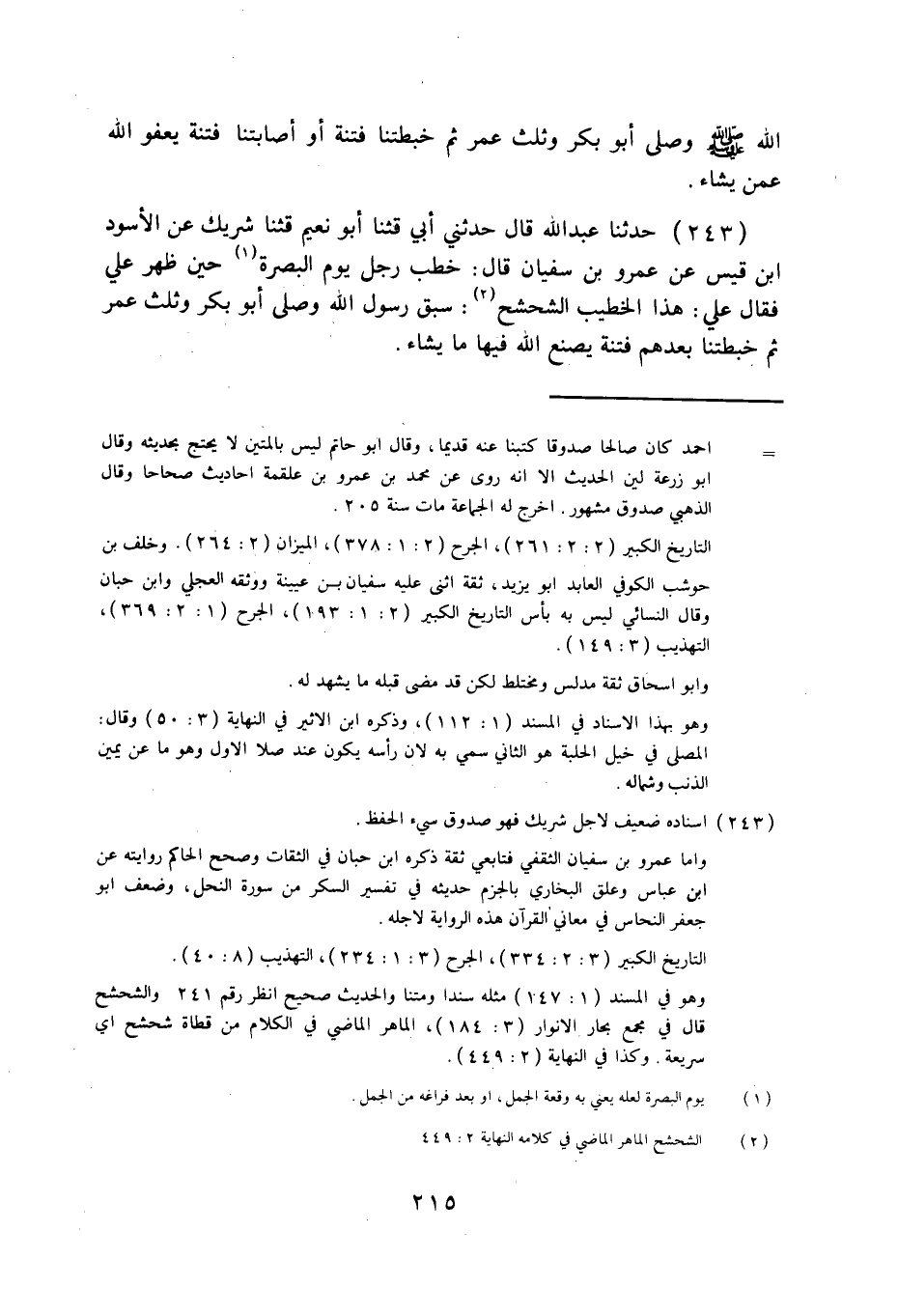 243 - حَدَّثَنَا عَبْدُ اللَّهِ قَالَ: حَدَّثَنِي أَبِي، قثنا أَبُو نُعَيْمٍ قثنا شَرِيكٌ، عَنِ الْأَسْوَدِ بْنِ قَيْسٍ، عَنْ عَمْرِو بْنِ سُفْيَانَ قَالَ: خَطَبَ رَجُلٌ يَوْمَ الْبَصْرَةِ حِينَ ظَهَرَ عَلِيٌّ، فَقَالَ عَلِيٌّ: §هَذَا الْخَطِيبُ الشَّحْشَحُ: سَبَقَ رَسُولُ اللَّهِ، وَصَلَّى أَبُو بَكْرٍ، وَثَلَّثَ عُمَرُ، ثُمَّ خَبَطَتْنَا بَعْدَهُمْ فِتْنَةٌ يَصْنَعُ اللَّهُ فِيهَا مَا يَشَاءُ.