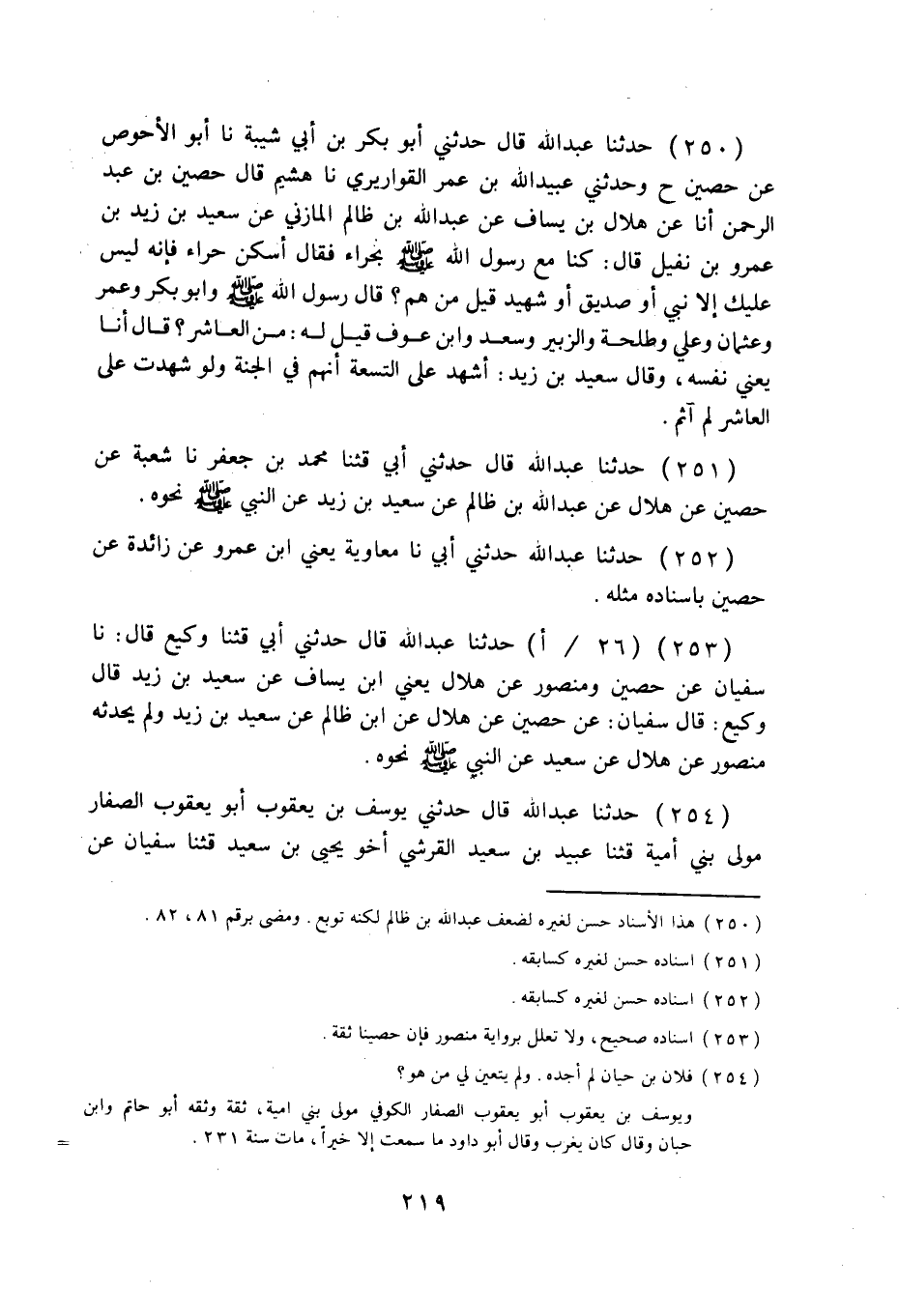 250 - حَدَّثَنَا عَبْدُ اللَّهِ قَالَ: حَدَّثَنِي أَبُو بَكْرِ بْنُ أَبِي شَيْبَةَ، نا أَبُو الْأَحْوَصِ، عَنْ حُصَيْنٍ، ح وَحَدَّثَنِي عُبَيْدُ اللَّهِ بْنُ عُمَرَ الْقَوَارِيرِيُّ، نا هُشَيْمٌ، قَالَ حُصَيْنُ بْنُ عَبْدِ الرَّحْمَنِ: أنا عَنْ هِلَالِ بْنِ يَسَافٍ، عَنْ عَبْدِ اللَّهِ بْنِ ظَالِمٍ الْمَازِنِيِّ، عَنْ سَعِيدِ بْنِ زَيْدِ بْنِ عَمْرِو بْنِ نُفَيْلٍ قَالَ: كُنَّا مَعَ رَسُولِ اللَّهِ صَلَّى اللهُ عَلَيْهِ وَسَلَّمَ بِحِرَاءٍ، فَقَالَ: «§اسْكُنْ حِرَاءُ، فَإِنَّهُ لَيْسَ عَلَيْكَ إِلَّا نَبِيٌّ، أَوْ صِدِّيقٌ، أَوْ شَهِيدٌ» ، قِيلَ: مَنْ هُمْ؟ قَالَ: رَسُولُ اللَّهِ صَلَّى اللهُ عَلَيْهِ وَسَلَّمَ وَأَبُو بَكْرٍ، وَعُمَرُ، وَعُثْمَانُ، وَعَلِيٌّ، وَطَلْحَةُ، وَالزُّبَيْرُ، وَسَعْدٌ، وَابْنُ عَوْفٍ، قِيلَ لَهُ: مَنِ الْعَاشِرُ؟ قَالَ: أَنَا، يَعْنِي نَفْسَهُ، وَقَالَ سَعِيدُ بْنُ زَيْدٍ: أَشْهَدُ عَلَى التِّسْعَةِ أَنَّهُمْ فِي الْجَنَّةِ، وَلَوْ شَهِدْتُ عَلَى الْعَاشِرِ لَمْ آثَمْ.