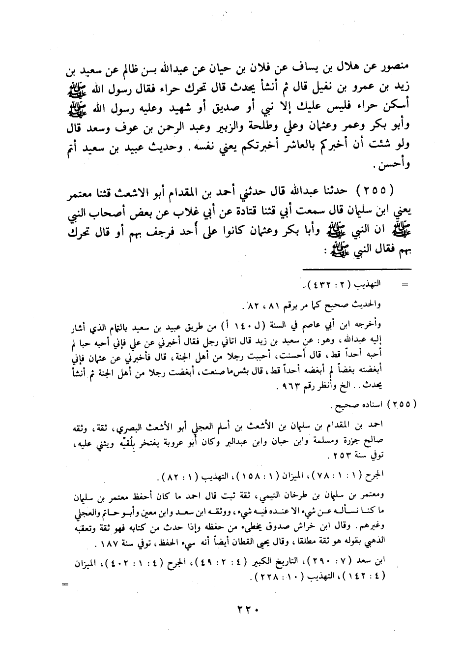 255 - حَدَّثَنَا عَبْدُ اللَّهِ قَالَ: حَدَّثَنِي أَحْمَدُ بْنُ الْمِقْدَامِ أَبُو الْأَشْعَثِ قثنا مُعْتَمِرٌ، يَعْنِي: ابْنَ سُلَيْمَانَ، قَالَ: سَمِعْتُ أَبِي قثنا قَتَادَةُ، عَنْ أَبِي غَلَّابٍ، عَنْ بَعْضِ أَصْحَابِ النَّبِيِّ صَلَّى اللهُ عَلَيْهِ وَسَلَّمَ، أَنَّ النَّبِيَّ صَلَّى اللهُ عَلَيْهِ وَسَلَّمَ وَأَبَا بَكْرٍ وَعُثْمَانَ كَانُوا عَلَى أُحُدٍ، فَرَجَفَ بِهِمْ، أَوْ قَالَ: تَحَرَّكَ بِهِمْ، فَقَالَ النَّبِيُّ صَلَّى اللهُ عَلَيْهِ وَسَلَّمَ: «§اثْبُتْ أُحُدُ، فَإِنَّ عَلَيْكَ نَبِيًّا، وَصِدِّيقًا، وَشَهِيدَيْنِ» .