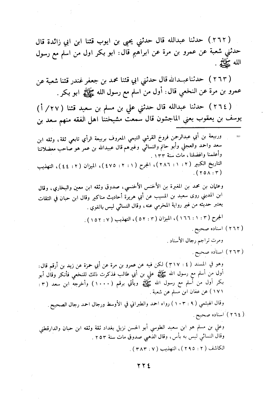 262 - حَدَّثَنَا عَبْدُ اللَّهِ قَالَ: حَدَّثَنِي يَحْيَى بْنُ أَيُّوبَ قثنا ابْنُ أَبِي زَائِدَةَ قَالَ: حَدَّثَنِي شُعْبَةُ، عَنْ عَمْرِو بْنِ مُرَّةَ، عَنْ إِبْرَاهِيمَ قَالَ: §أَبُو بَكْرٍ أَوَّلُ مَنْ أَسْلَمَ مَعَ رَسُولِ اللَّهِ صَلَّى اللهُ عَلَيْهِ وَسَلَّمَ.
