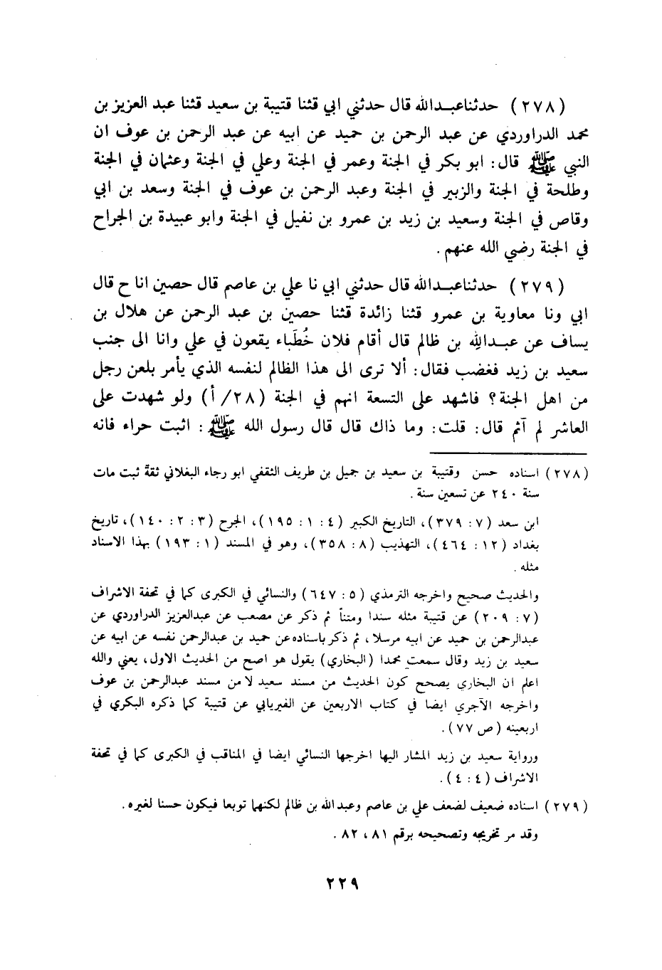 278 - حَدَّثَنَا عَبْدُ اللَّهِ قَالَ: حَدَّثَنِي أَبِي، قثنا قُتَيْبَةُ بْنُ سَعِيدٍ قثنا عَبْدُ الْعَزِيزِ بْنُ مُحَمَّدٍ الدَّرَاوَرْدِيُّ، عَنْ عَبْدِ الرَّحْمَنِ بْنِ حُمَيْدٍ، عَنْ أَبِيهِ، عَنْ عَبْدِ الرَّحْمَنِ بْنِ عَوْفٍ، أَنَّ النَّبِيَّ صَلَّى اللهُ عَلَيْهِ وَسَلَّمَ قَالَ: «§أَبُو بَكْرٍ فِي الْجَنَّةِ، وَعُمَرُ فِي الْجَنَّةِ، وَعَلِيٌّ فِي الْجَنَّةِ، وَعُثْمَانُ فِي الْجَنَّةِ، وَطَلْحَةُ فِي الْجَنَّةِ، وَالزُّبَيْرُ فِي الْجَنَّةِ، وَعَبْدُ الرَّحْمَنِ بْنُ عَوْفٍ فِي الْجَنَّةِ، وَسَعْدُ بْنُ أَبِي وَقَّاصٍ فِي الْجَنَّةِ، وَسَعِيدُ بْنُ زَيْدِ بْنِ عَمْرِو بْنِ نُفَيْلٍ فِي الْجَنَّةِ، وَأَبُو عُبَيْدَةَ بْنُ الْجَرَّاحِ فِي الْجَنَّةِ رَضِيَ اللَّهُ عَنْهُمْ» .