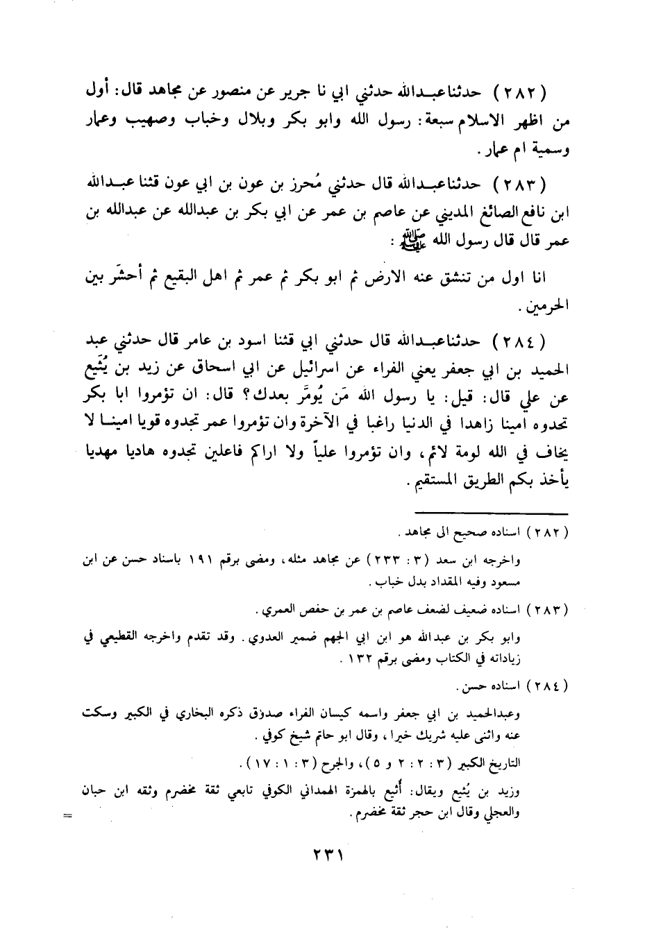 282 - حَدَّثَنَا عَبْدُ اللَّهِ، حَدَّثَنِي أَبِي، نا جَرِيرٌ، عَنْ مَنْصُورٍ، عَنْ مُجَاهِدٍ قَالَ: §أَوَّلُ مَنْ أَظْهَرَ الْإِسْلَامَ سَبْعَةٌ: رَسُولُ اللَّهِ صَلَّى اللهُ عَلَيْهِ وَسَلَّمَ وَأَبُو بَكْرٍ، وَبِلَالٌ، وَخَبَّابٌ، وَصُهَيْبٌ، وَعَمَّارٌ وَسُمَيَّةُ أُمُّ عَمَّارٍ.