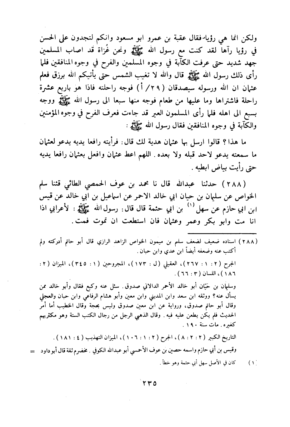 288 - حَدَّثَنَا عَبْدُ اللَّهِ قَالَ: نا مُحَمَّدُ بْنُ عَوْفٍ الْحِمْصِيُّ الطَّائِيُّ قثنا سَلَمٌ الْخَوَّاصُ، عَنْ سُلَيْمَانَ بْنِ حَيَّانَ أَبِي خَالِدٍ الْأَحْمَرِ، عَنْ إِسْمَاعِيلَ بْنِ أَبِي خَالِدٍ، عَنْ قَيْسِ بْنِ أَبِي حَازِمٍ، عَنْ سَهْلِ بْنِ أَبِي حَثْمَةَ قَالَ: قَالَ رَسُولُ اللَّهِ صَلَّى اللهُ عَلَيْهِ وَسَلَّمَ لِأَعْرَابِيٍّ: «§إِذَا أَنَا مُتُّ وَأَبُو بَكْرٍ وَعُمَرُ وَعُثْمَانُ، فَإِنِ اسْتَطَعْتَ أَنْ تَمُوتَ فَمُتْ» .