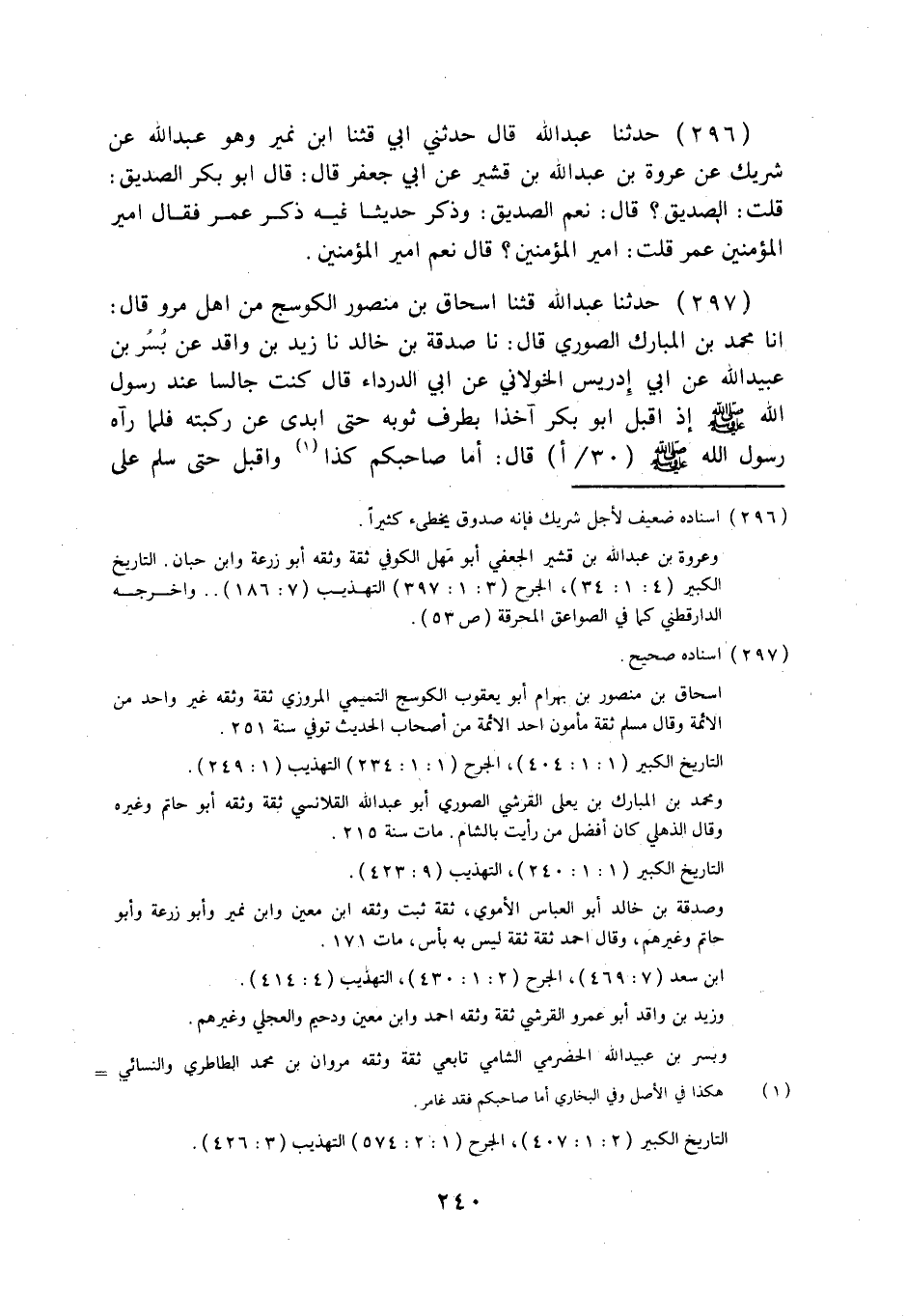 297 - حَدَّثَنَا عَبْدُ اللَّهِ قثنا إِسْحَاقُ بْنُ مَنْصُورٍ الْكَوْسَجُ، مِنْ أَهْلِ مَرْوَ، قَالَ: أنا مُحَمَّدُ بْنُ الْمُبَارَكِ الصُّورِيُّ قَالَ: نا صَدَقَةُ بْنُ خَالِدٍ، نا زَيْدُ بْنُ وَاقِدٍ، عَنْ بُسْرِ بْنِ عُبَيْدِ اللَّهِ، عَنْ أَبِي إِدْرِيسَ الْخَوْلَانِيِّ، عَنْ أَبِي الدَّرْدَاءِ قَالَ: كُنْتُ جَالِسًا عِنْدَ رَسُولِ اللَّهِ صَلَّى اللهُ عَلَيْهِ وَسَلَّمَ إِذْ أَقْبَلَ أَبُو بَكْرٍ آخِذًا بِطَرَفِ ثَوْبِهِ حَتَّى أَبْدَى عَنْ رُكْبَتِهِ، فَلَمَّا رَآهُ رَسُولُ اللَّهِ صَلَّى اللهُ عَلَيْهِ وَسَلَّمَ قَالَ: «أَمَّا صَاحِبُكُمْ فَقَدْ غَامَرَ» ، وَأَقْبَلَ حَتَّى سَلَّمَ عَلَى رَسُولِ اللَّهِ صَلَّى اللهُ عَلَيْهِ وَسَلَّمَ فَقَالَ: يَا رَسُولَ اللَّهِ، إِنَّهُ كَانَ بَيْنِي وَبَيْنَ عُمَرَ شَيْءٌ، فَأَسْرَعْتُ إِلَيْهِ، ثُمَّ إِنِّي نَدِمْتُ عَلَى مَا كَانَ مِنِّي إِلَيْهِ، فَسَأَلْتُهُ أَنْ يَغْفِرَ لِي، فَأَبَى عَلَيَّ، فَتَبِعْتُهُ الْبَقِيعَ كُلَّهُ، حَتَّى تَحَرَّزَ بِدَارِهِ مِنِّي، وَأَقْبَلَتُ إِلَيْكَ، فَقَالَ رَسُولُ اللَّهِ صَلَّى اللهُ عَلَيْهِ وَسَلَّمَ: «يَغْفِرُ اللَّهُ لَكَ يَا أَبَا بَكْرٍ» ثَلَاثَ مَرَّاتٍ، ثُمَّ إِنَّ عُمَرَ نَدِمَ حِينَ سَأَلَهُ أَبُو بَكْرٍ أَنْ يَغْفِرَ لَهُ فَأَبَى عَلَيْهِ، ثُمَّ خَرَجَ مِنْ مَنْزِلِهِ حَتَّى أَتَى مَنْزِلَ أَبِي بَكْرٍ فَسَأَلَ: هَلْ ثَمَّ أَبُو بَكْرٍ؟ فَقَالُوا: لَا، فَعَلِمَ أَنَّهُ عِنْدَ رَسُولِ اللَّهِ، فَأَقْبَلَ عُمَرُ إِلَى رَسُولِ اللَّهِ صَلَّى اللهُ عَلَيْهِ وَسَلَّمَ حَتَّى سَلَّمَ عَلَيْهِ، فَجَعَلَ وَجْهُ رَسُولِ اللَّهِ صَلَّى اللهُ عَلَيْهِ وَسَلَّمَ يَتَمَعَّرُ حَتَّى أَشْفَقَ أَبُو بَكْرٍ أَنْ يَكُونَ مِنْ رَسُولِ اللَّهِ إِلَى عُمَرَ مَا يَكْرَهُ، فَلَمَّا رَأَى ذَلِكَ أَبُو بَكْرٍ جَثَا عَلَى رُكْبَتَيْهِ فَقَالَ: يَا رَسُولَ اللَّهِ، أَنَا وَاللَّهِ كُنْتُ أَظْلَمَ، فَقَالَ رَسُولُ اللَّهِ صَلَّى اللهُ عَلَيْهِ وَسَلَّمَ: " §يَا أَيُّهَا النَّاسُ، إِنَّ اللَّهَ بَعَثَنِي إِلَيْكُمْ فَقُلْتُمْ: كَذَبْتَ، وَقَالَ أَبُو بَكْرٍ: صَدَقْتَ، وَوَاسَانِي بِنَفْسِهِ وَمَالِهِ، فَهَلْ أَنْتُمْ تَارِكُو لِي صَاحِبِي " ثَلَاثَ مَرَّاتٍ، قَالَ: فَمَا أُوذِيَ بَعْدَهَا.