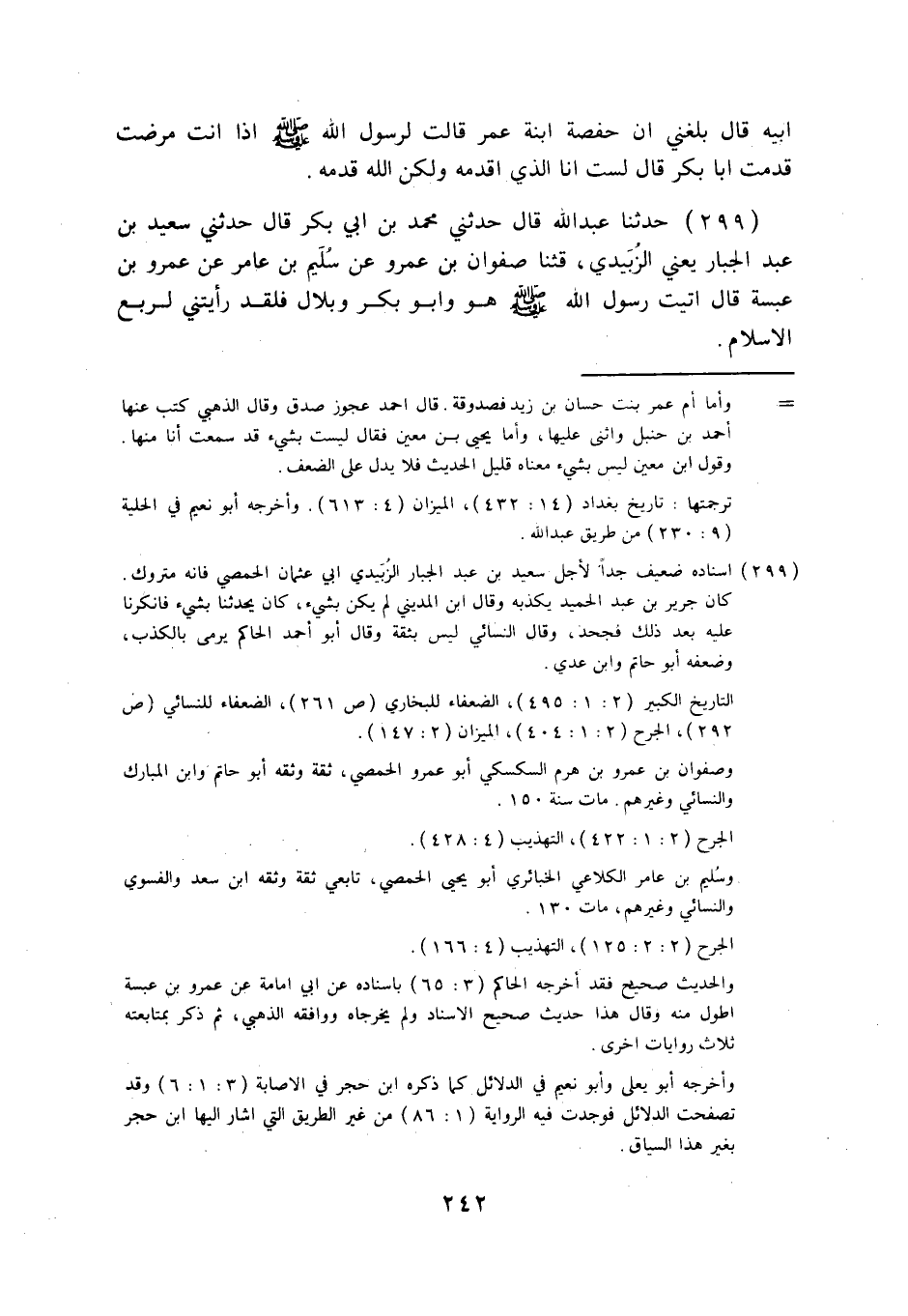 299 - حَدَّثَنَا عَبْدُ اللَّهِ قَالَ: حَدَّثَنِي مُحَمَّدُ بْنُ أَبِي بَكْرٍ قَالَ: حَدَّثَنِي سَعِيدُ بْنُ عَبْدِ الْجَبَّارِ، يَعْنِي:، الزُّبَيْدِيَّ، قثنا صَفْوَانُ بْنُ عَمْرٍو، عَنْ سُلَيْمِ بْنِ عَامِرٍ، عَنْ عَمْرِو بْنِ عَبْسَةَ قَالَ: أَتَيْتُ رَسُولَ اللَّهِ صَلَّى اللهُ عَلَيْهِ وَسَلَّمَ هُوَ وَأَبُو بَكْرٍ وَبِلَالٌ، فَلَقَدْ §رَأَيْتُنِي لَرُبُعُ الْإِسْلَامِ.