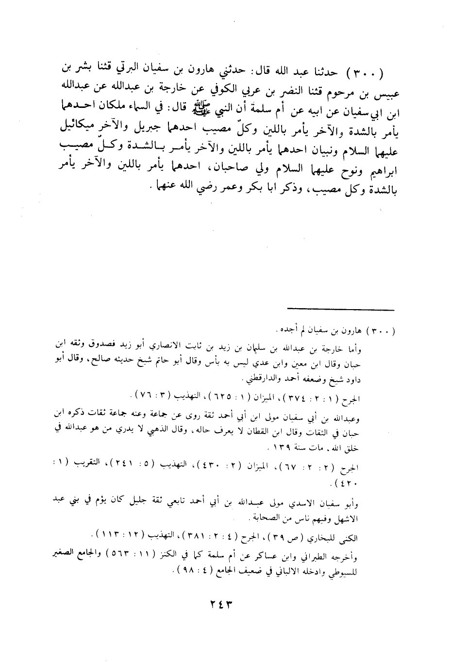 300 - حَدَّثَنَا عَبْدُ اللَّهِ قَالَ: حَدَّثَنِي هَارُونُ بْنُ سُفْيَانَ الْبِرْتِيُّ قثنا بِشْرُ بْنُ عُبَيْسِ بْنِ مَرْحُومٍ قثنا النَّضْرُ بْنُ عَرَبِيٍّ الْكُوفِيُّ، عَنْ خَارِجَةَ بْنِ عَبْدِ اللَّهِ، عَنْ عَبْدِ اللَّهِ بْنِ أَبِي سُفْيَانَ، عَنْ أَبِيهِ، عَنْ أُمِّ سَلَمَةَ، أَنَّ النَّبِيَّ صَلَّى اللهُ عَلَيْهِ وَسَلَّمَ قَالَ: " فِي السَّمَاءِ مَلَكَانِ، أَحَدُهُمَا يَأْمُرُ بِالشِّدَّةِ، وَالْآخَرُ يَأْمُرُ بِاللِّينِ، وَكُلٌّ مُصِيبٌ: أَحَدُهُمَا جِبْرِيلُ، وَالْآخَرُ مِيكَائِيلُ عَلَيْهِمَا السَّلَامُ، وَنَبِيَّانِ أَحَدُهُمَا يَأْمُرُ بِاللِّينِ، وَالْآخَرُ يَأْمُرُ بِالشِّدَّةِ، وَكُلٌّ مُصِيبٌ إِبْرَاهِيمُ وَنُوحٌ عَلَيْهِمَا السَّلَامُ، §وَلِي صَاحِبَانِ، أَحَدُهُمَا يَأْمُرُ بِاللِّينِ، وَالْآخَرُ يَأْمُرُ بِالشِّدَّةِ، وَكُلٌّ مُصِيبٌ "، وَذَكَرَ أَبَا بَكْرٍ وَعُمَرَ رَضِيَ اللَّهُ عَنْهُمَا.