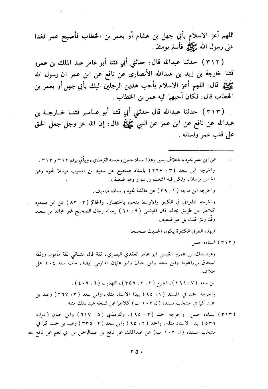 312 - حَدَّثَنَا عَبْدُ اللَّهِ قَالَ: حَدَّثَنِي أَبِي، قثنا أَبُو عَامِرٍ عَبْدُ الْمَلِكِ بْنُ عَمْرٍو قثنا خَارِجَةُ بْنُ زَيْدِ بْنِ عَبْدِ اللَّهِ الْأَنْصَارِيُّ، عَنْ نَافِعٍ، عَنِ ابْنِ عُمَرَ، أَنَّ رَسُولَ اللَّهِ صَلَّى اللهُ عَلَيْهِ وَسَلَّمَ قَالَ: «§اللَّهُمَّ أَعِزَّ الْإِسْلَامَ بِأَحَبِّ هَذَيْنِ الرَّجُلَيْنِ إِلَيْكَ بِأَبِي جَهْلٍ، أَوْ بِعُمَرَ بْنِ الْخَطَّابِ» ، قَالَ: فَكَانَ أَحَبَّهُمَا إِلَيْهِ عُمَرُ بْنُ الْخَطَّابِ.