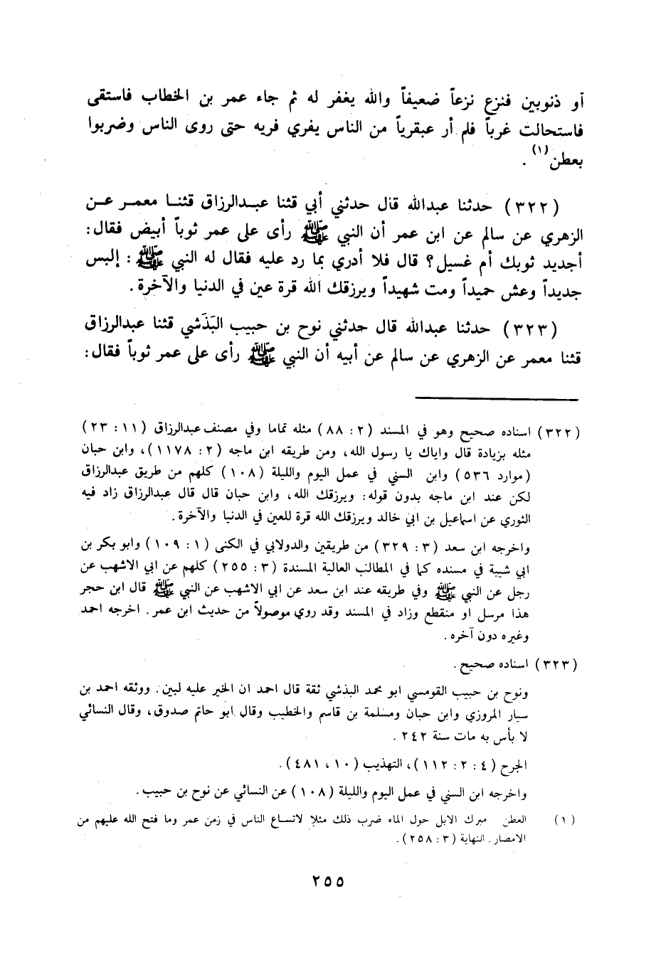 323 - حَدَّثَنَا عَبْدُ اللَّهِ قَالَ: حَدَّثَنِي نُوحُ بْنُ حَبِيبٍ الْبَذَشِيُّ قثنا عَبْدُ الرَّزَّاقِ قثنا مَعْمَرٌ، عَنِ الزُّهْرِيِّ، عَنْ سَالِمٍ، عَنْ أَبِيهِ، أَنَّ النَّبِيَّ صَلَّى اللهُ عَلَيْهِ وَسَلَّمَ رَأَى عَلَى عُمَرَ ثَوْبًا، فَقَالَ: «أَجَدِيدٌ هُوَ أَمْ غَسِيلٌ؟» قَالَ: غَسِيلٌ، فَقَالَ: «§الْبَسْ جَدِيدًا، وَعِشْ حَمِيدًا، وَمُتْ شَهِيدًا» .