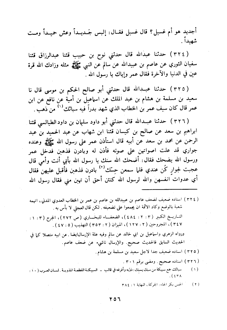325 - حَدَّثَنَا عَبْدُ اللَّهِ قَالَ: حَدَّثَنِي أَبُو صَالِحٍ الْحَكَمُ بْنُ مُوسَى قَالَ نا سَعِيدُ بْنُ مَسْلَمَةَ بْنِ هِشَامِ بْنِ عَبْدِ الْمَلِكِ، عَنْ إِسْمَاعِيلَ بْنِ أُمَيَّةَ، عَنْ نَافِعٍ، عَنِ ابْنِ عُمَرَ قَالَ: §كَانَ سَيْفُ عُمَرَ بْنِ الْخَطَّابِ الَّذِي شَهِدَ بَدْرًا فِيهِ سَبَائِكُ مِنْ ذَهَبٍ.