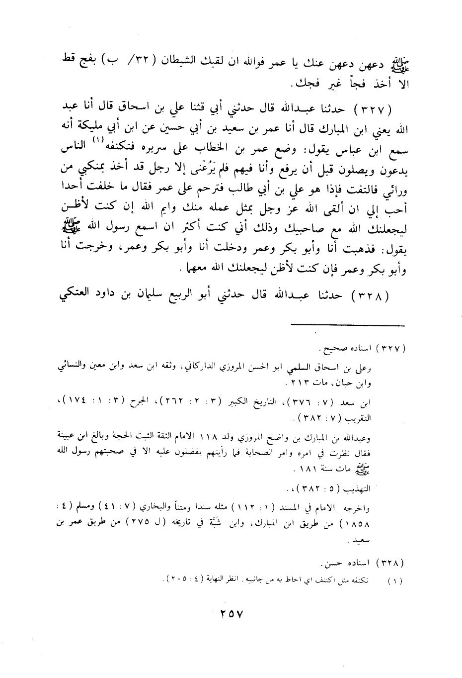 327 - حَدَّثَنَا عَبْدُ اللَّهِ قَالَ: حَدَّثَنِي أَبِي، قثنا عَلِيُّ بْنُ إِسْحَاقَ قَالَ: أنا عَبْدُ اللَّهِ، يَعْنِي: ابْنَ الْمُبَارَكِ قَالَ: أنا عُمَرُ بْنُ سَعِيدِ بْنِ أَبِي حُسَيْنٍ، عَنِ ابْنِ أَبِي مُلَيْكَةَ، أَنَّهُ سَمِعَ ابْنَ عَبَّاسٍ يَقُولُ: وُضِعَ عُمَرُ بْنُ الْخَطَّابِ عَلَى سَرِيرِهِ فَتَكَنَّفَهُ النَّاسُ يَدْعُونَ وَيُصَلُّونَ قَبْلَ أَنْ يُرْفَعَ، وَأَنَا فِيهِمْ، فَلَمْ يَرُعْنِي إِلَّا رَجُلٌ قَدْ أَخَذَ بِمَنْكِبِي مِنْ وَرَائِي، فَالْتَفَتُّ فَإِذَا هُوَ عَلِيُّ بْنُ أَبِي طَالِبٍ، فَتَرَحَّمَ عَلَى عُمَرَ فَقَالَ: §مَا خَلَّفْتُ أَحَدًا أَحَبَّ إِلَيَّ أَنْ أَلْقَى اللَّهَ عَزَّ وَجَلَّ بِمِثْلِ عَمَلِهِ مِنْكَ، وَايْمُ اللَّهِ إِنْ كُنْتُ لَأَظُنُّ لَيَجْعَلَنَّكَ اللَّهُ مَعَ صَاحِبَيْكَ، وَذَلِكَ أَنِّي كُنْتُ أُكْثِرُ أَنْ أَسْمَعَ رَسُولَ اللَّهِ صَلَّى اللهُ عَلَيْهِ وَسَلَّمَ يَقُولُ: «فَذَهَبْتُ أَنَا وَأَبُو بَكْرٍ وَعُمَرُ، وَدَخَلْتُ أَنَا وَأَبُو بَكْرٍ وَعُمَرُ، وَخَرَجْتُ أَنَا وَأَبُو بَكْرٍ وَعُمَرُ» ، فَإِنْ كُنْتُ لَأَظُنُّ لَيَجْعَلَنَّكَ اللَّهُ مَعَهُمَا.