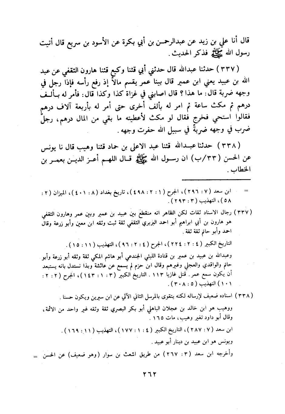 337 - حَدَّثَنَا عَبْدُ اللَّهِ قَالَ: حَدَّثَنِي أَبِي، قثنا وَكِيعٌ قثنا هَارُونُ الثَّقَفِيُّ، عَنْ عَبْدِ اللَّهِ بْنِ عُبَيْدٍ، يَعْنِي: ابْنَ عُمَيْرٍ، قَالَ: بَيْنَا عُمَرُ يَقْسِمُ مَالًا إِذْ رَفَعَ رَأْسَهُ فَإِذَا رَجُلٌ فِي وَجْهِهِ ضَرْبَةٌ قَالَ: مَا هَذَا؟ قَالَ: أَصَابَنِي فِي غَزَاةِ كَذَا وَكَذَا، قَالَ: فَأَمَرَ لَهُ بِأَلْفِ دِرْهَمٍ، ثُمَّ مَكَثَ سَاعَةً ثُمَّ أَمَرَ لَهُ بِأَلْفٍ أُخْرَى حَتَّى أَمَرَ لَهُ بِأَرْبَعَةِ آلَافِ دِرْهَمٍ، فَقَالُوا: اسْتَحِي، فَخَرَجَ، فَقَالَ: §لَوْ مَكَثَ لَأَعْطَيْتُهُ مَا بَقِيَ مِنَ الْمَالِ دِرْهَمٌ، رَجُلٌ ضُرِبَ فِي وَجْهِهِ ضَرْبَةً فِي سَبِيلِ اللَّهِ حَفَرَتْ وَجْهَهُ.