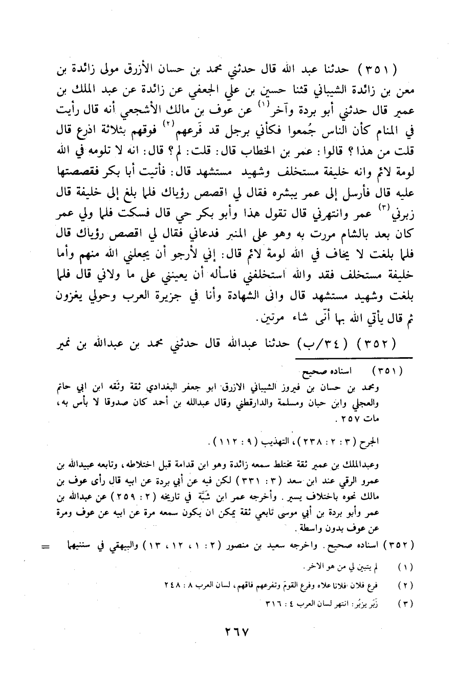 351 - حَدَّثَنَا عَبْدُ اللَّهِ قَالَ: حَدَّثَنِي مُحَمَّدُ بْنُ حَسَّانَ الْأَزْرَقُ، مَوْلَى زَائِدَةَ بْنِ مَعْنِ بْنِ زَائِدَةَ الشَّيْبَانِيِّ، قثنا حُسَيْنُ بْنُ عَلِيٍّ الْجُعْفِيُّ، عَنْ زَائِدَةَ، عَنْ عَبْدِ الْمَلِكِ بْنِ عُمَيْرٍ قَالَ: حَدَّثَنِي أَبُو بُرْدَةَ، وَآخَرُ، عَنْ عَوْفِ بْنِ مَالِكٍ الْأَشْجَعِيِّ أَنَّهُ قَالَ: رَأَيْتُ فِي الْمَنَامِ كَأَنَّ النَّاسَ جُمِعُوا، فَكَأَنِّي بِرَجُلٍ قَدْ فَرَعَهُمْ فَوْقَهُمْ بِثَلَاثَةِ أَذْرُعٍ، قَالَ: قُلْتُ: مَنْ هَذَا؟ قَالُوا: عُمَرُ بْنُ الْخَطَّابِ، قَالَ: قُلْتُ: لِمَ؟ §إِنَّهُ لَا تَلُومُهُ فِي اللَّهِ لَوْمَةُ لَائِمٍ، وَإِنَّهُ خَلِيفَةٌ مُسْتَخْلَفٌ، وَشَهِيدٌ مُسْتَشْهَدٌ، قَالَ: فَأَتَيْتُ أَبَا بَكْرٍ فَقَصَصْتُهَا عَلَيْهِ، قَالَ: فَأَرْسَلَ إِلَى عُمَرَ يُبَشِّرُهُ، فَقَالَ لِي: اقْصُصْ رُؤْيَاكَ، فَلَمَّا بَلَغَ إِلَى خَلِيفَةٍ قَالَ: زَبَرَنِي عُمَرُ وَانْتَهَرَنِي قَالَ: تَقُولُ هَذَا وَأَبُو بَكْرٍ حَيٌّ؟ قَالَ: فَسَكَتُّ، فَلَمَّا وَلِيَ عُمَرُ كَانَ بَعْدُ بِالشَّامِ مَرَرْتُ بِهِ وَهُوَ عَلَى الْمِنْبَرِ، فَدَعَانِي فَقَالَ لِي: اقْصُصْ رُؤْيَاكَ، قَالَ: فَلَمَّا بَلَغْتُ لَا يَخَافُ فِي اللَّهِ لَوْمَةَ لَائِمٍ قَالَ: إِنِّي لَأَرْجُو أَنْ يَجْعَلَنِي اللَّهُ مِنْهُمْ، وَأَمَّا خَلِيفَةٌ مُسْتَخْلَفٌ فَقَدْ وَاللَّهِ اسْتَخْلَفَنِي، فَأَسْأَلُهُ أَنْ يُعِينَنِي عَلَى مَا وَلَّانِي، قَالَ: فَلَمَّا بَلَغْتُ: وَشَهِيدٌ مُسْتَشْهَدٌ قَالَ: وَأَنَّى الشَّهَادَةُ وَأَنَا فِي جَزِيرَةِ الْعَرَبِ وَحَوْلِي يَغْزُونَ، ثُمَّ قَالَ: يَأْتِي اللَّهُ بِهَا أَنَّى شَاءَ، مَرَّتَيْنِ.