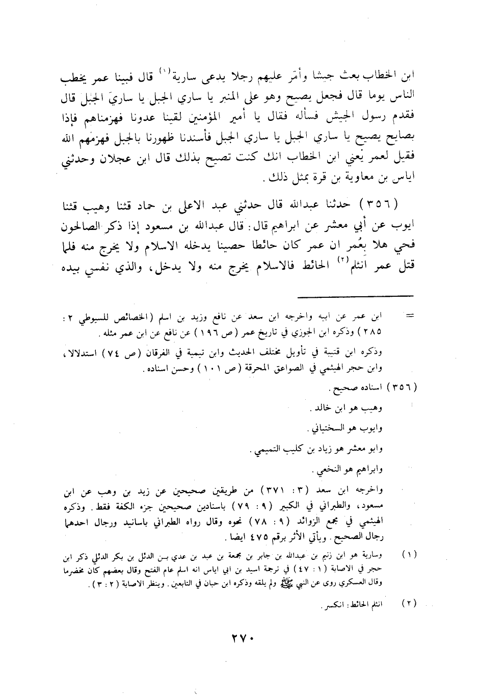 356 - حَدَّثَنَا عَبْدُ اللَّهِ قَالَ: حَدَّثَنِي عَبْدُ الْأَعْلَى بْنُ حَمَّادٍ قثنا وُهَيْبٌ قثنا أَيُّوبُ، عَنْ أَبِي مَعْشَرٍ، عَنْ إِبْرَاهِيمَ قَالَ: قَالَ عَبْدُ اللَّهِ بْنُ مَسْعُودٍ: إِذَا ذُكِرَ الصَّالِحُونَ فَحَيَّهَلَا بِعُمَرَ، §إِنَّ عُمَرَ كَانَ حَائِطًا حَصِينًا، يَدْخُلُهُ الْإِسْلَامُ وَلَا يَخْرُجُ مِنْهُ، فَلَمَّا قُتِلَ عُمَرُ انْثَلَمَ الْحَائِطُ، فَالْإِسْلَامُ يَخْرُجُ مِنْهُ وَلَا يَدْخُلُ، وَالَّذِي نَفْسِي بِيَدِهِ لَوَدِدْتُ أَنِّي خَادِمٌ لِمِثْلِ عُمَرَ حَتَّى أَمُوتَ، وَالَّذِي نَفْسِي بِيَدِهِ لَوْ أَنَّ مَنْ فِي الْأَرْضِ الْيَوْمَ وُضِعُوا فِي كِفَّةِ الْمِيزَانِ، وَوُضِعَ عُمَرُ فِي الْكِفَّةِ الْأُخْرَى، لَرَجَحَ شِقُّ عُمَرَ، إِنَّ عُمَرَ كَانَ يَأْمُرُ بِالْجَزُورِ فَتُنْحَرُ فَتَكُونُ الْكَبِدُ وَالسَّنَامُ وَأَطَايِبُهَا لِابْنِ السَّبِيلِ، وَيَكُونُ الْعُنُقُ لِآلِ عُمَرَ، إِذَا ذُكِرَ الصَّالِحُونَ فَحَيَّ هَلَا بِعُمَرَ.