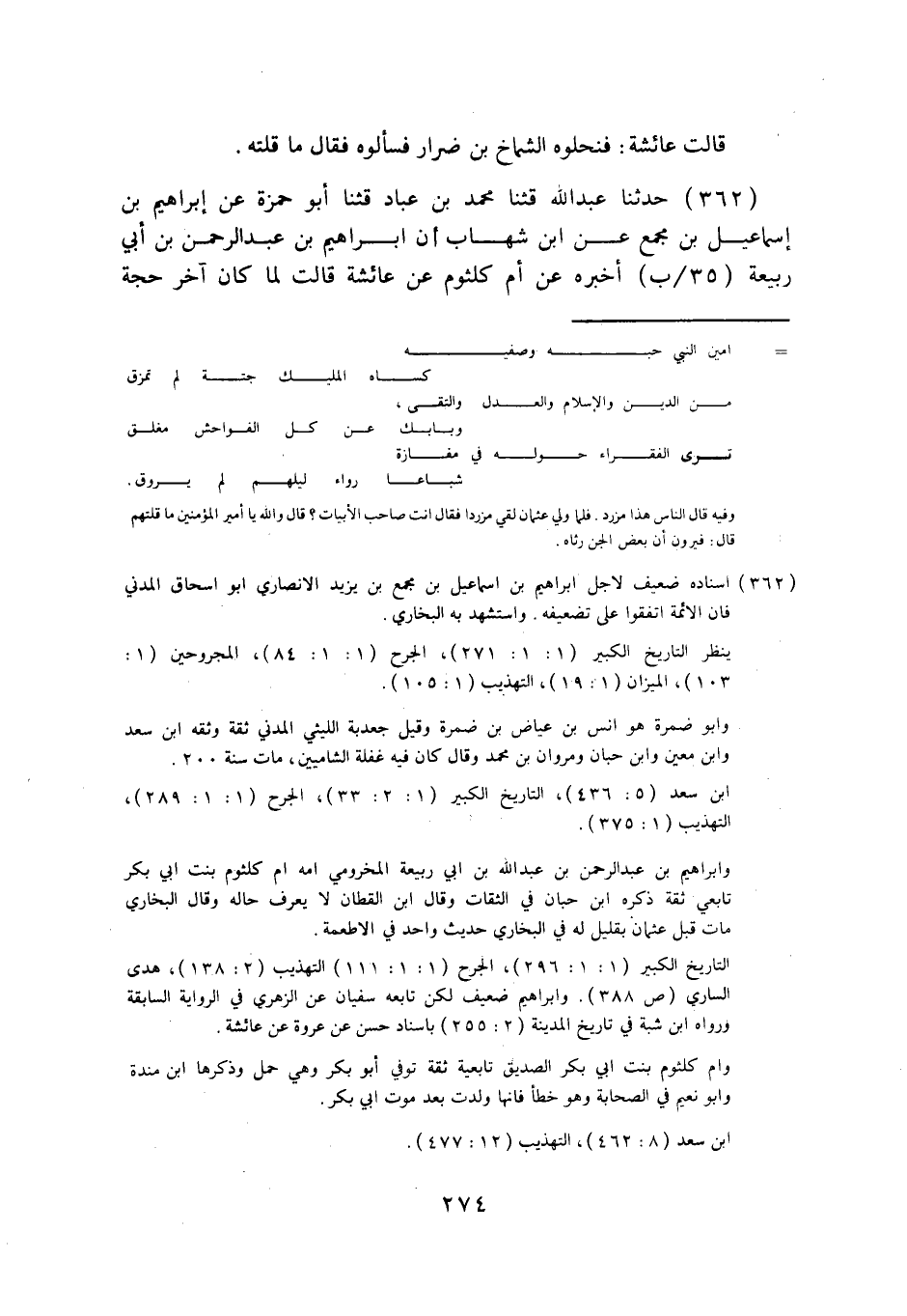 362 - حَدَّثَنَا عَبْدُ اللَّهِ قثنا مُحَمَّدُ بْنُ عَبَّادٍ قثنا أَبُو ضَمْرَةَ، عَنْ إِبْرَاهِيمَ بْنِ إِسْمَاعِيلَ بْنِ مُجَمِّعٍ، عَنِ ابْنِ شِهَابٍ، أَنَّ إِبْرَاهِيمَ بْنَ عَبْدِ الرَّحْمَنِ بْنِ أَبِي رَبِيعَةَ أَخْبَرَهُ، عَنْ أُمِّ كُلْثُومٍ، عَنْ عَائِشَةَ قَالَتْ: لَمَّا كَانَ آخِرُ حَجَّةٍ حَجَّهَا عُمَرُ حَجَّ أُمَّهَاتُ الْمُؤْمِنِينَ، فَلَمَّا صَدَرْنَا عَنْ مِنًى مَرُّوا بِالْمُحَصَّبِ، فَسَمِعْتُ رَجُلًا عَلَى رَاحِلَتِهِ يَقُولُ: أَيْنَ كَانَ أَمِيرُ الْمُؤْمِنِينَ؟ فَسَمِعْتُ آخَرَ قَالَ: كَانَ هَاهُنَا كَانَ أَمِيرُ الْمُؤْمِنِينَ، قَالَتْ: فَأَنَاخَ رَاحِلَتَهُ ثُمَّ قَالَ: