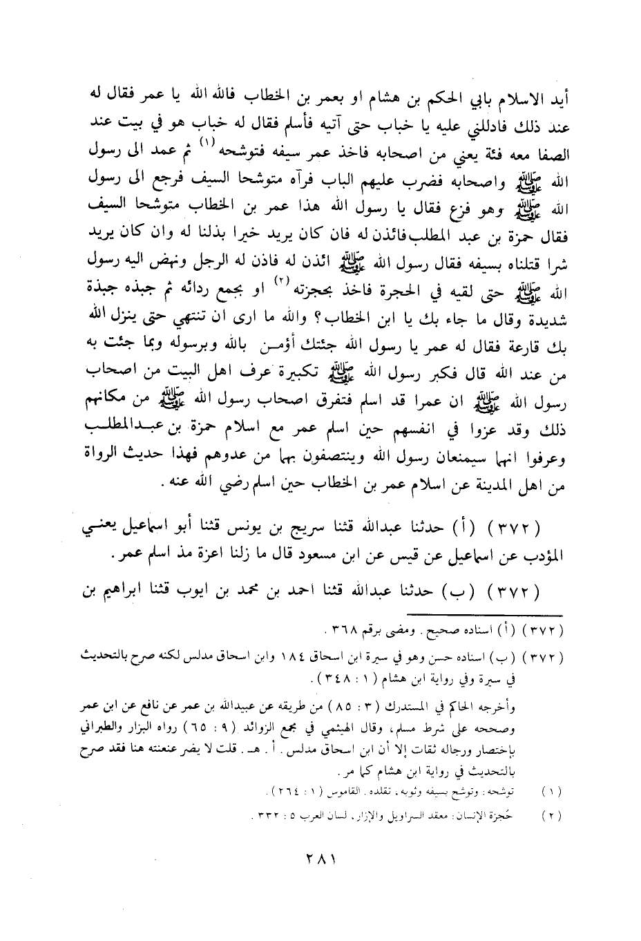 372 - حَدَّثَنَا عَبْدُ اللَّهِ قثنا سُرَيْجُ بْنُ يُونُسَ قثنا أَبُو إِسْمَاعِيلَ يَعْنِي الْمُؤَدِّبُ، عَنْ إِسْمَاعِيلَ، عَنْ قَيْسٍ، عَنِ ابْنِ مَسْعُودٍ قَالَ: «§مَا زِلْنَا أَعِزَّةً مُذْ أَسْلَمَ عُمَرُ»
