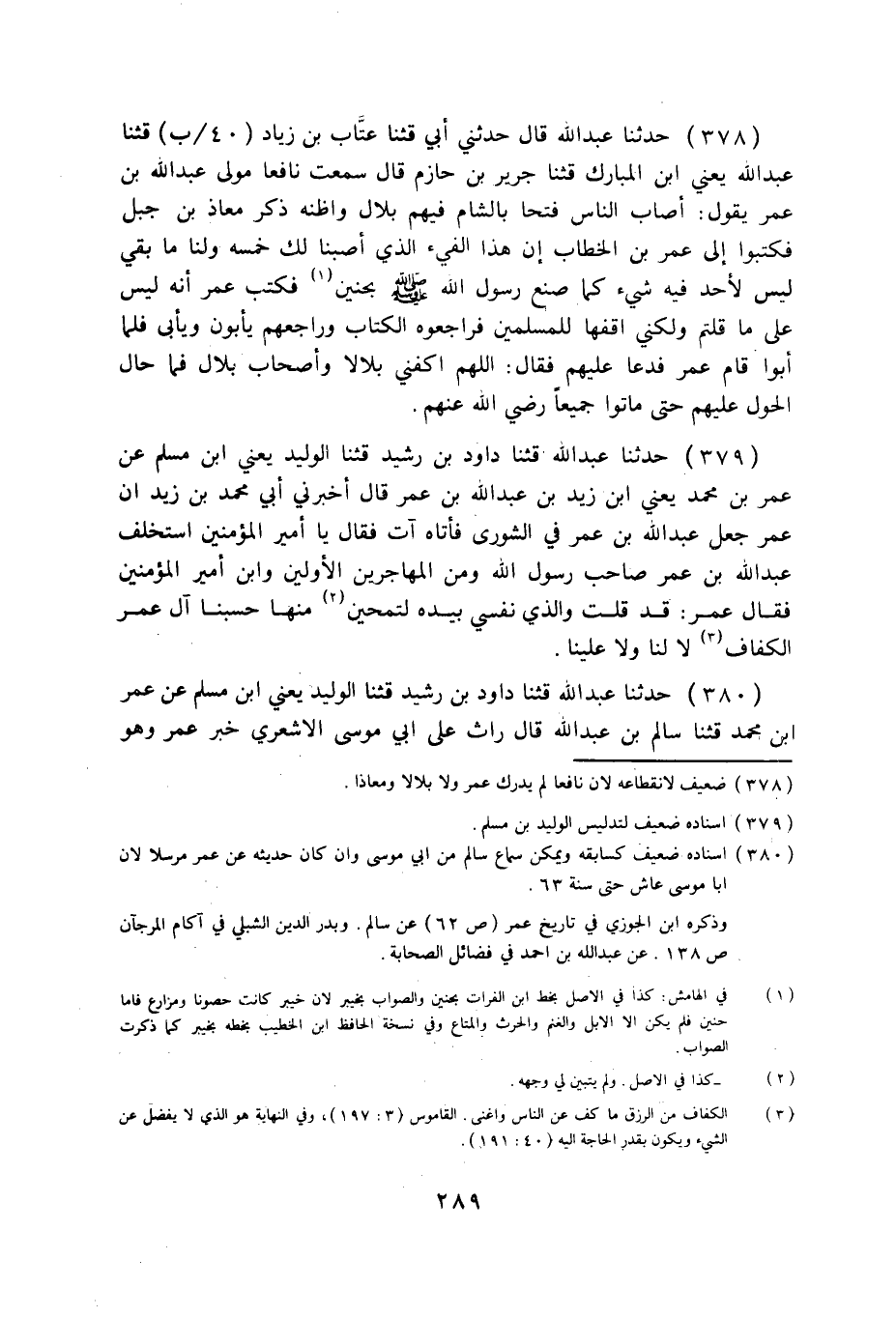 378 - حَدَّثَنَا عَبْدُ اللَّهِ قَالَ: حَدَّثَنِي أَبِي، قثنا عَتَّابُ بْنُ زِيَادٍ قثنا عَبْدُ اللَّهِ، يَعْنِي: ابْنَ الْمُبَارَكِ، قثنا جَرِيرُ بْنُ حَازِمٍ قَالَ: سَمِعْتُ نَافِعًا مَوْلَى عَبْدِ اللَّهِ بْنِ عُمَرَ يَقُولُ: أَصَابَ النَّاسُ فَتْحًا بِالشَّامِ، فِيهِمْ بِلَالٌ، وَأَظُنُّهُ ذَكَرَ مُعَاذَ بْنَ جَبَلٍ، فَكَتَبُوا إِلَى عُمَرَ بْنِ الْخَطَّابِ: إِنَّ هَذَا الْفَيْءَ الَّذِي أَصَبْنَا لَكَ خُمُسُهُ، وَلَنَا مَا بَقِيَ لَيْسَ لِأَحَدٍ فِيهِ شَيْءٌ، كَمَا صَنَعَ رَسُولُ اللَّهِ صَلَّى اللهُ عَلَيْهِ وَسَلَّمَ بِحُنَيْنٍ، فَكَتَبَ عُمَرُ: إِنَّهُ لَيْسَ عَلَى مَا قُلْتُمْ، وَلَكِنِّي أَقِفُهَا لِلْمُسْلِمِينَ، فَرَاجَعُوهُ الْكِتَابَ، وَرَاجَعَهُمْ، يَأْبَوْنَ وَيَأْبَى، فَلَمَّا أَبَوْا قَامَ عُمَرُ فَدَعَا عَلَيْهِمْ فَقَالَ: §اللَّهُمَّ اكْفِنِي بِلَالًا وَأَصْحَابَ بِلَالٍ، فَمَا حَالَ الْحَوْلُ عَلَيْهِمْ حَتَّى مَاتُوا جَمِيعًا رَضِيَ اللَّهُ عَنْهُمْ.
