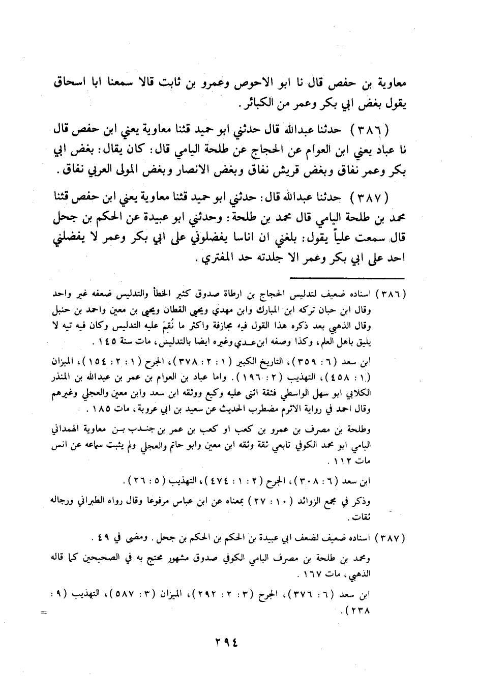 386 - حَدَّثَنَا عَبْدُ اللَّهِ قَالَ: حَدَّثَنِي أَبُو حُمَيْدٍ قثنا مُعَاوِيَةُ، يَعْنِي: ابْنَ حَفْصٍ قَالَ: نا عَبَّادٌ، يَعْنِي: ابْنَ الْعَوَّامِ، عَنِ الْحَجَّاجِ، عَنْ طَلْحَةَ الْيَامِيِّ قَالَ: كَانَ يُقَالُ: §بُغْضُ أَبِي بَكْرٍ وَعُمَرَ نِفَاقٌ، وَبُغْضُ قُرَيْشٍ نِفَاقٌ، وَبُغْضُ الْأَنْصَارِ وَبُغْضُ الْمَوْلَى الْعَرَبِيِّ نِفَاقٌ.