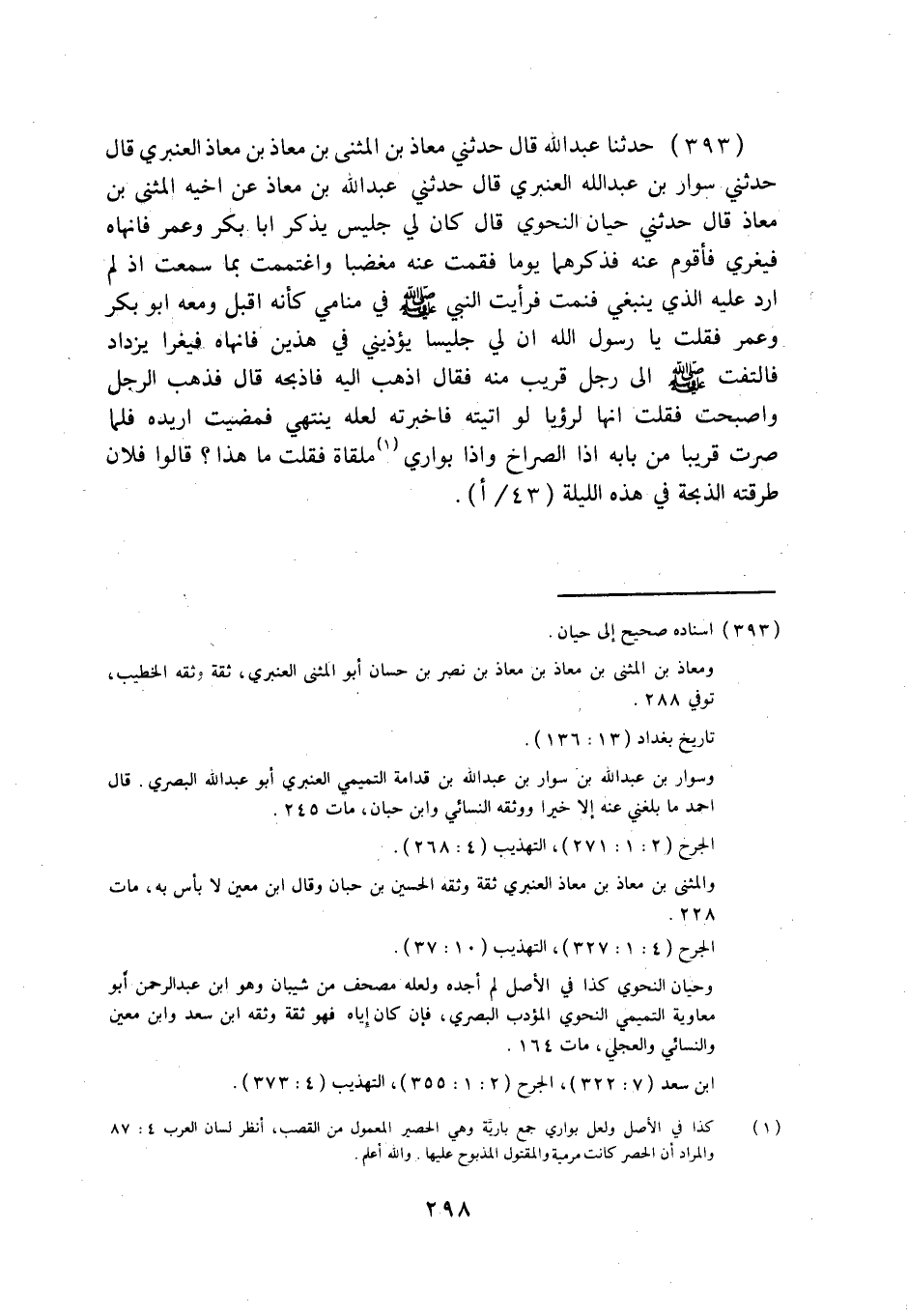 393 - حَدَّثَنَا عَبْدُ اللَّهِ قَالَ: حَدَّثَنِي مُعَاذُ بْنُ الْمُثَنَّى بْنِ مُعَاذِ بْنِ مُعَاذٍ الْعَنْبَرِيُّ قَالَ: حَدَّثَنِي سَوَّارُ بْنُ عَبْدِ اللَّهِ الْعَنْبَرِيُّ قَالَ: حَدَّثَنِي عَبْدُ اللَّهِ بْنُ مُعَاذٍ، عَنْ أَخِيهِ الْمُثَنَّى بْنِ مُعَاذٍ قَالَ: حَدَّثَنِي حَيَّانُ النَّحْوِيُّ قَالَ: كَانَ لِي جَلِيسٌ يَذْكُرُ أَبَا بَكْرٍ وَعُمَرَ، فَأَنْهَاهُ فَيُغْرِي، فَأَقُومُ عَنْهُ، فَذَكَرَهُمَا يَوْمًا فَقُمْتُ عَنْهُ مُغْضَبًا، وَاغْتَمَمْتُ بِمَا سَمِعْتُ إِذْ لَمْ أَرُدَّ عَلَيْهِ الَّذِي يَنْبَغِي، فَنِمْتُ فَرَأَيْتُ النَّبِيَّ صَلَّى اللهُ عَلَيْهِ وَسَلَّمَ فِي مَنَامِي كَأَنَّهُ أَقْبَلَ وَمَعَهُ أَبُو بَكْرٍ وَعُمَرُ، فَقُلْتُ: يَا رَسُولَ اللَّهِ، إِنَّ لِي جَلِيسًا يُؤْذِينِي فِي هَذَيْنِ، فَأَنْهَاهُ فَيُغْرِي يَزْدَادُ، فَالْتَفَتَ صَلَّى اللهُ عَلَيْهِ وَسَلَّمَ إِلَى رَجُلٍ قَرِيبٍ مِنْهُ فَقَالَ: «§اذْهَبْ إِلَيْهِ فَاذْبَحْهُ» ، قَالَ: فَذَهَبَ الرَّجُلُ، وَأَصْبَحْتُ فَقُلْتُ: إِنَّهَا لَرُؤْيَا، لَوْ أَتَيْتُهُ فَأَخْبَرْتُهُ لَعَلَّهُ يَنْتَهِي، فَمَضَيْتُ أُرِيدُهُ، فَلَمَّا صِرْتُ قَرِيبًا مِنْ بَابِهِ إِذَا الصُّرَاخُ وَإِذَا بَوَارِيُّ مُلْقَاةٌ، فَقُلْتُ: مَا هَذَا؟ قَالُوا: فُلَانٌ طَرَقَتْهُ الذَّبْحَةُ فِي هَذِهِ اللَّيْلَةِ.