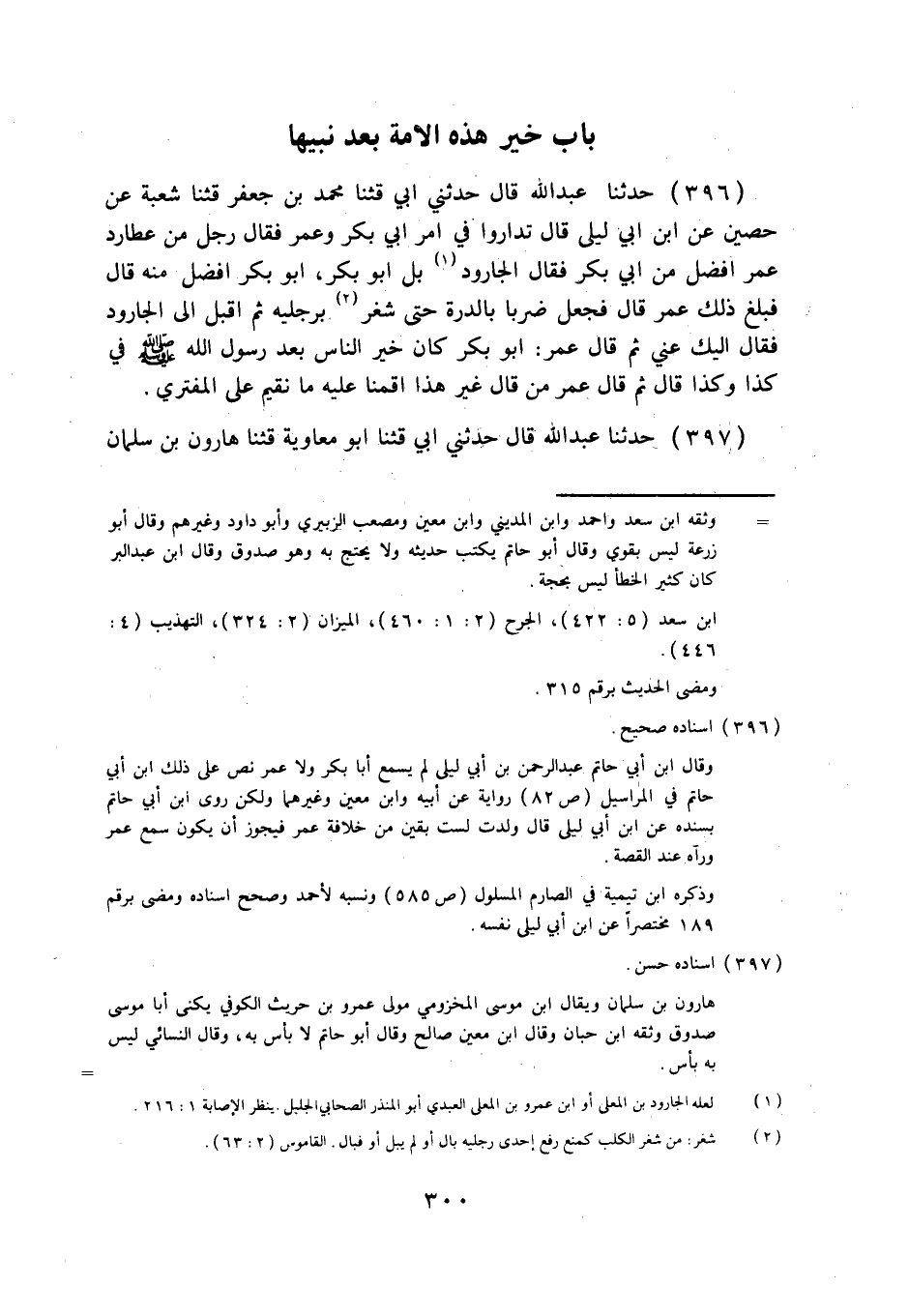 396 - حَدَّثَنَا عَبْدُ اللَّهِ قَالَ: حَدَّثَنِي أَبِي، قثنا مُحَمَّدُ بْنُ جَعْفَرٍ قثنا شُعْبَةُ، عَنْ حُصَيْنٍ، عَنِ ابْنِ أَبِي لَيْلَى قَالَ: تَدَارَوْا فِي أَمْرِ أَبِي بَكْرٍ وَعُمَرَ، فَقَالَ رَجُلٌ مِنْ عُطَارِدَ: عُمَرُ أَفْضَلُ مِنْ أَبِي بَكْرٍ، فَقَالَ الْجَارُودُ: بَلْ أَبُو بَكْرٍ، أَبُو بَكْرٍ أَفْضَلُ مِنْهُ، قَالَ: فَبَلَغَ ذَلِكَ عُمَرَ، قَالَ: فَجَعَلَ ضَرْبًا بِالدِّرَّةِ حَتَّى شَغَرَ بِرِجْلَيْهِ، ثُمَّ أَقْبَلَ إِلَى الْجَارُودِ فَقَالَ: إِلَيْكَ عَنِّي، ثُمَّ قَالَ عُمَرُ: §أَبُو بَكْرٍ كَانَ خَيْرَ النَّاسِ بَعْدَ رَسُولِ اللَّهِ صَلَّى اللهُ عَلَيْهِ وَسَلَّمَ فِي كَذَا وَكَذَا، قَالَ: ثُمَّ قَالَ عُمَرُ: مَنْ قَالَ غَيْرَ هَذَا أَقَمْنَا عَلَيْهِ مَا نُقِيمُ عَلَى الْمُفْتَرِي.