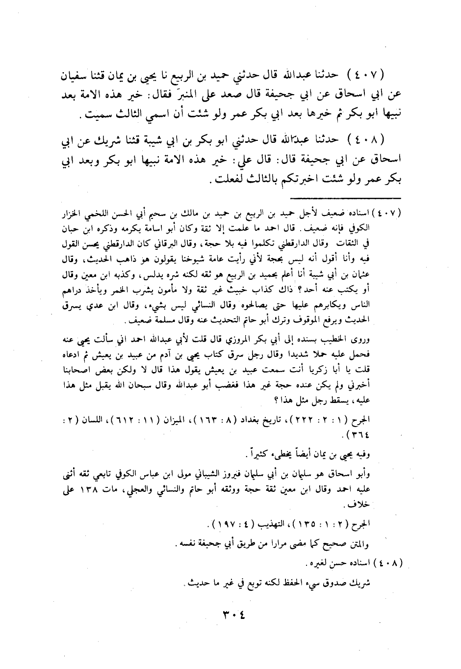 407 - حَدَّثَنَا عَبْدُ اللَّهِ قَالَ: حَدَّثَنِي حُمَيْدُ بْنُ الرَّبِيعِ، نا يَحْيَى بْنُ يَمَانٍ قثنا سُفْيَانُ، عَنْ أَبِي إِسْحَاقَ، عَنْ أَبِي جُحَيْفَةَ قَالَ: صَعِدَ عَلِيٌّ الْمِنْبَرَ فَقَالَ: §خَيْرُ هَذِهِ الْأُمَّةِ بَعْدَ نَبِيِّهَا أَبُو بَكْرٍ، ثُمَّ خَيْرُهَا بَعْدَ أَبِي بَكْرٍ عُمَرُ، وَلَوْ شِئْتُ أَنْ أُسَمِّيَ الثَّالِثَ سَمَّيْتُ.