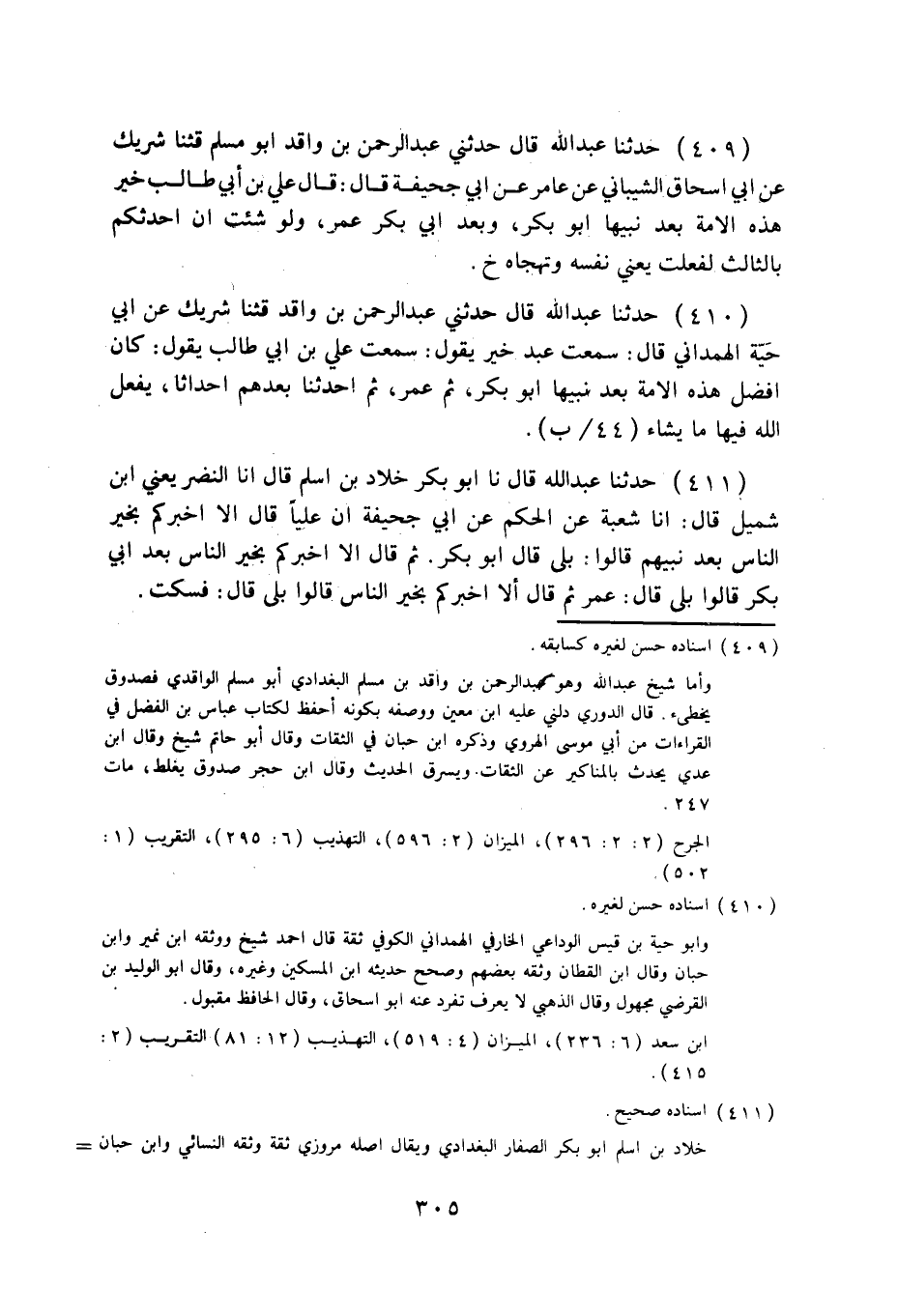 411 - حَدَّثَنَا عَبْدُ اللَّهِ قَالَ: نا أَبُو بَكْرٍ خَلَّادُ بْنُ أَسْلَمَ قَالَ: أنا النَّضْرُ، يَعْنِي: ابْنُ شُمَيْلٍ، قَالَ أنا شُعْبَةُ، عَنِ الْحَكَمِ، عَنْ أَبِي جُحَيْفَةَ، أَنَّ عَلِيًّا قَالَ: §أَلَا أُخْبِرُكُمْ بِخَيْرِ النَّاسِ بَعْدَ نَبِيِّهِمْ؟ قَالُوا: بَلَى، قَالَ: أَبُو بَكْرٍ، ثُمَّ قَالَ: أَلَا أُخْبِرُكُمْ بِخَيْرِ النَّاسِ بَعْدَ أَبِي بَكْرٍ؟ قَالُوا: بَلَى، قَالَ: عُمَرُ، ثُمَّ قَالَ: أَلَا أُخْبِرُكُمْ بِخَيْرِ النَّاسِ؟ قَالُوا: بَلَى، قَالَ: فَسَكَتَ.