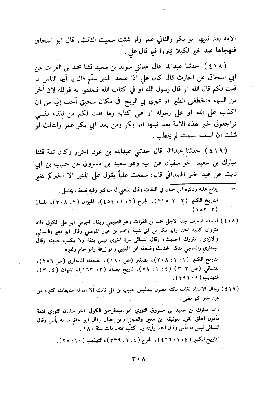 419 - حَدَّثَنَا عَبْدُ اللَّهِ قَالَ: حَدَّثَنِي عَبْدُ اللَّهِ بْنُ عَوْنٍ الْخَرَّازُ، وَكَانَ ثِقَةً، قثنا مُبَارَكُ بْنُ سَعِيدٍ أَخُو سُفْيَانَ، عَنْ أَبِيهِ وَهُوَ سَعِيدُ بْنُ مَسْرُوقٍ، عَنْ حَبِيبِ بْنِ أَبِي ثَابِتٍ، عَنْ عَبْدِ خَيْرٍ الْهَمْدَانِيِّ قَالَ: سَمِعْتُ عَلِيًّا يَقُولُ عَلَى الْمِنْبَرِ: §أَلَا أُخْبِرُكُمْ بِخَيْرِ هَذِهِ الْأُمَّةِ بَعْدَ نَبِيِّهَا؟ قَالَ: فَذَكَرَ أَبَا بَكْرٍ، ثُمَّ قَالَ: أَلَا أُخْبِرُكُمْ بِالثَّانِي؟ قَالَ: فَذَكَرَ عُمَرَ، ثُمَّ قَالَ: لَوْ شِئْتُ لَأَنْبَأْتُكُمْ بِالثَّالِثِ، قَالَ: وَسَكَتَ، قَالَ: فَرَأَيْنَا أَنَّهُ يَعْنِي نَفْسَهُ، فَقُلْتُ: أَنْتَ سَمِعْتَهُ يَقُولُ هَذَا؟ قَالَ: نَعَمْ، وَرَبِّ الْكَعْبَةِ.