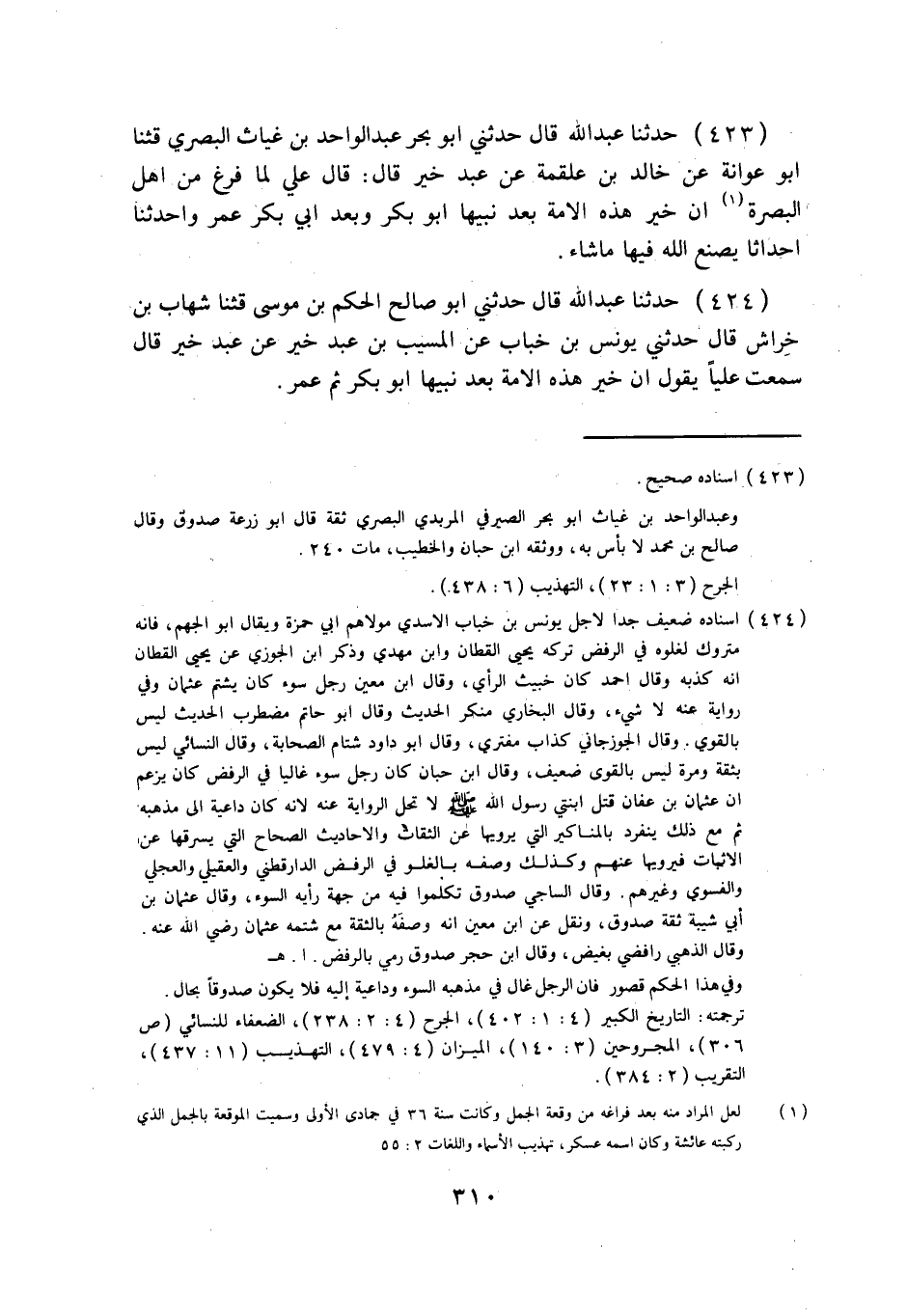 423 - حَدَّثَنَا عَبْدُ اللَّهِ قَالَ: حَدَّثَنِي أَبُو بَحْرٍ عَبْدُ الْوَاحِدِ بْنُ غِيَاثٍ الْبَصْرِيُّ قثنا أَبُو عَوَانَةَ، عَنْ خَالِدِ بْنِ عَلْقَمَةَ، عَنْ عَبْدِ خَيْرٍ قَالَ: قَالَ عَلِيٌّ لَمَّا فَرَغَ مِنْ أَهْلِ الْبَصْرَةِ: §إِنَّ خَيْرَ هَذِهِ الْأُمَّةِ بَعْدَ نَبِيِّهَا أَبُو بَكْرٍ، وَبَعْدَ أَبِي بَكْرٍ عُمَرُ، وَأَحْدَثْنَا أَحْدَاثًا يَصْنَعُ اللَّهُ فِيهَا مَا شَاءَ.