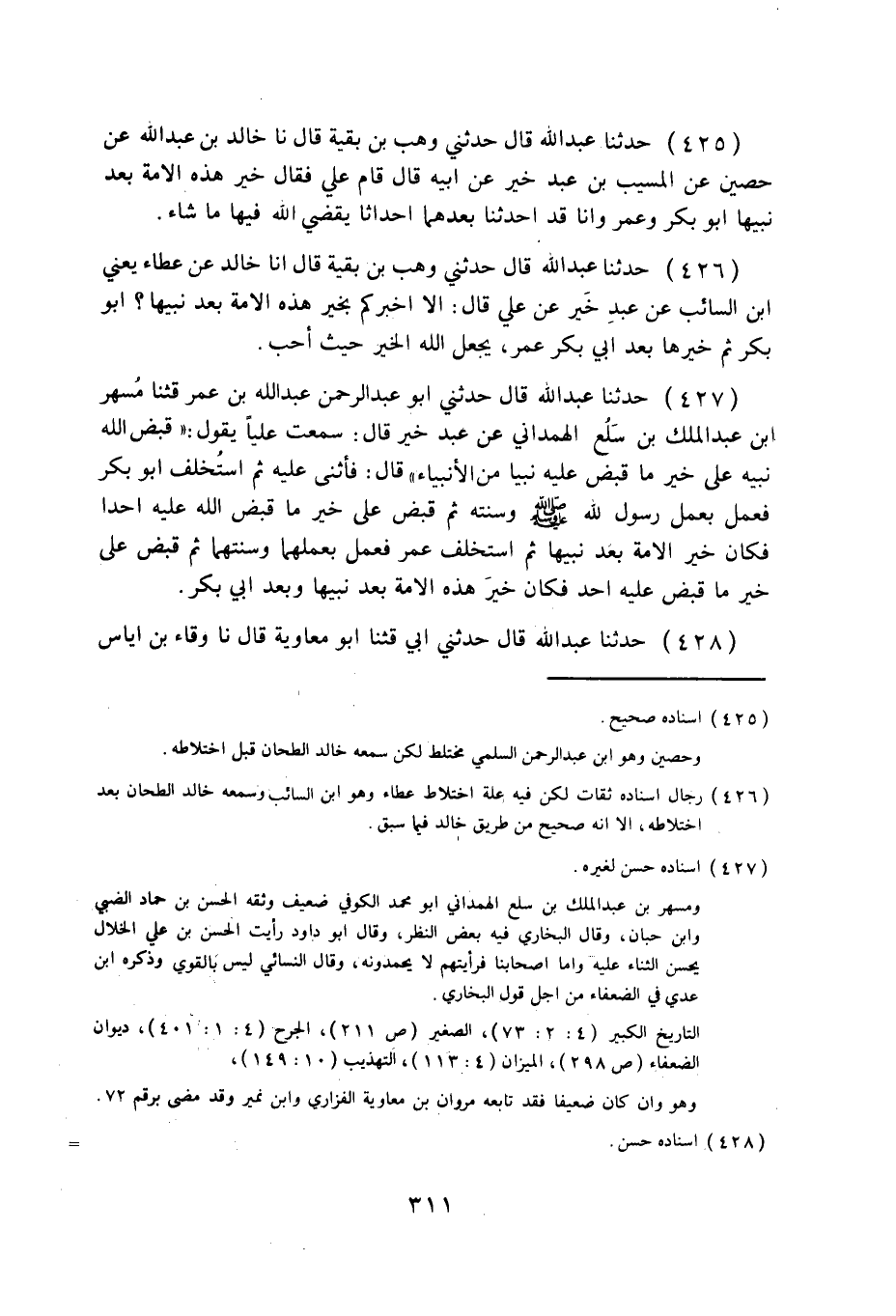 425 - حَدَّثَنَا عَبْدُ اللَّهِ قَالَ: حَدَّثَنِي وَهْبُ بْنُ بَقِيَّةَ قَالَ نا خَالِدُ بْنُ عَبْدِ اللَّهِ، عَنْ حُصَيْنٍ، عَنِ الْمُسَيَّبِ بْنِ عَبْدِ خَيْرٍ، عَنْ أَبِيهِ قَالَ: قَامَ عَلِيٌّ فَقَالَ: §خَيْرُ هَذِهِ الْأُمَّةِ بَعْدَ نَبِيِّهَا أَبُو بَكْرٍ وَعُمَرُ، وَإِنَّا قَدْ أَحْدَثْنَا بَعْدَهُمَا أَحْدَاثًا يَقْضِي اللَّهُ فِيهَا مَا شَاءَ.