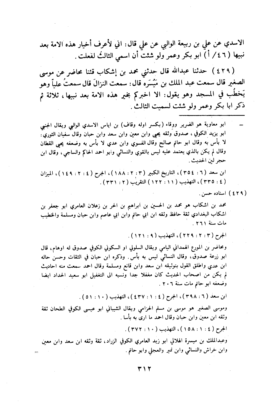 429 - حَدَّثَنَا عَبْدُ اللَّهِ قَالَ: حَدَّثَنِي مُحَمَّدُ بْنُ إِشْكَابَ قثنا مُحَاضِرٌ، عَنْ مُوسَى الصَّغِيرِ قَالَ: سَمِعْتُ عَبْدَ الْمَلِكِ بْنَ مَيْسَرَةَ قَالَ: سَمِعْتُ النَّزَّالَ قَالَ: سَمِعْتُ عَلِيًّا وَهُوَ يَخْطُبُ فِي الْمَسْجِدِ وَهُوَ يَقُولُ: §أَلَا أُخْبِرُكُمْ بِخَيْرِ هَذِهِ الْأُمَّةِ بَعْدَ نَبِيِّهَا؟ ثَلَاثَةً، ثُمَّ ذَكَرَ أَبَا بَكْرٍ وَعُمَرَ، وَلَوْ شِئْتُ لَسَمَّيْتُ الثَّالِثَ.