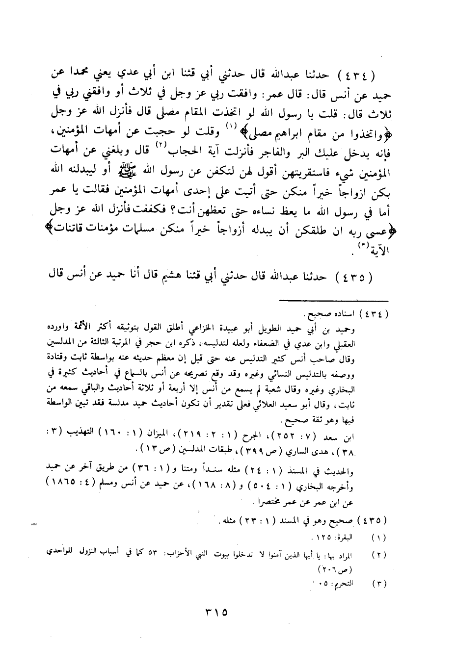 434 - حَدَّثَنَا عَبْدُ اللَّهِ قَالَ: حَدَّثَنِي أَبِي، قثنا ابْنُ أَبِي عَدِيٍّ، يَعْنِي مُحَمَّدًا، عَنْ حُمَيْدٍ، عَنْ أَنَسٍ قَالَ: قَالَ عُمَرُ: §وَافَقْتُ رَبِّي عَزَّ وَجَلَّ فِي ثَلَاثٍ، أَوْ وَافَقَنِي رَبِّي فِي ثَلَاثٍ، قَالَ: قُلْتُ: يَا رَسُولَ اللَّهِ، لَوِ اتَّخَذْتَ الْمَقَامَ مُصَلًّى، قَالَ: فَأَنْزَلَ اللَّهُ عَزَّ وَجَلَّ: {وَاتَّخِذُوا مِنْ مَقَامِ إِبْرَاهِيمَ مُصَلًّى} [البقرة: 125] ، وَقُلْتُ: لَوْ حَجَبْتَ عَنْ أُمَّهَاتِ الْمُؤْمِنِينَ، فَإِنَّهُ يَدْخُلُ عَلَيْكَ الْبَرُّ وَالْفَاجِرُ، فَأُنْزِلَتْ آيَةُ الْحِجَابِ، قَالَ: وَبَلَغَنِي عَنْ أُمَّهَاتِ الْمُؤْمِنِينَ شَيْءٌ فَاسْتَقْرَيْتُهُنَّ أَقُولُ لَهُنَّ: لَتَكُفُّنَّ عَنْ رَسُولِ اللَّهِ صَلَّى اللهُ عَلَيْهِ وَسَلَّمَ أَوْ لَيُبْدِلَنَّهُ اللَّهُ بِكُنَّ أَزْوَاجًا خَيْرًا مِنْكُنَّ، حَتَّى أَتَيْتُ عَلَى إِحْدَى أُمَّهَاتِ الْمُؤْمِنِينَ، فَقَالَتْ: يَا عُمَرُ، أَمَا فِي رَسُولِ اللَّهِ مَا يَعِظُ نِسَاءَهُ، حَتَّى تَعِظَهُنَّ أَنْتَ؟ فَكَفَفْتُ، فَأَنْزَلَ اللَّهُ عَزَّ وَجَلَّ: {عَسَى رَبُّهُ إِنْ طَلَّقَكُنَّ أَنْ يُبْدِلَهُ أَزْوَاجًا خَيْرًا مِنْكُنَّ مُسْلِمَاتٍ مُؤْمِنَاتٍ قَانِتَاتٍ} [التحريم: 5] الْآيَةَ "