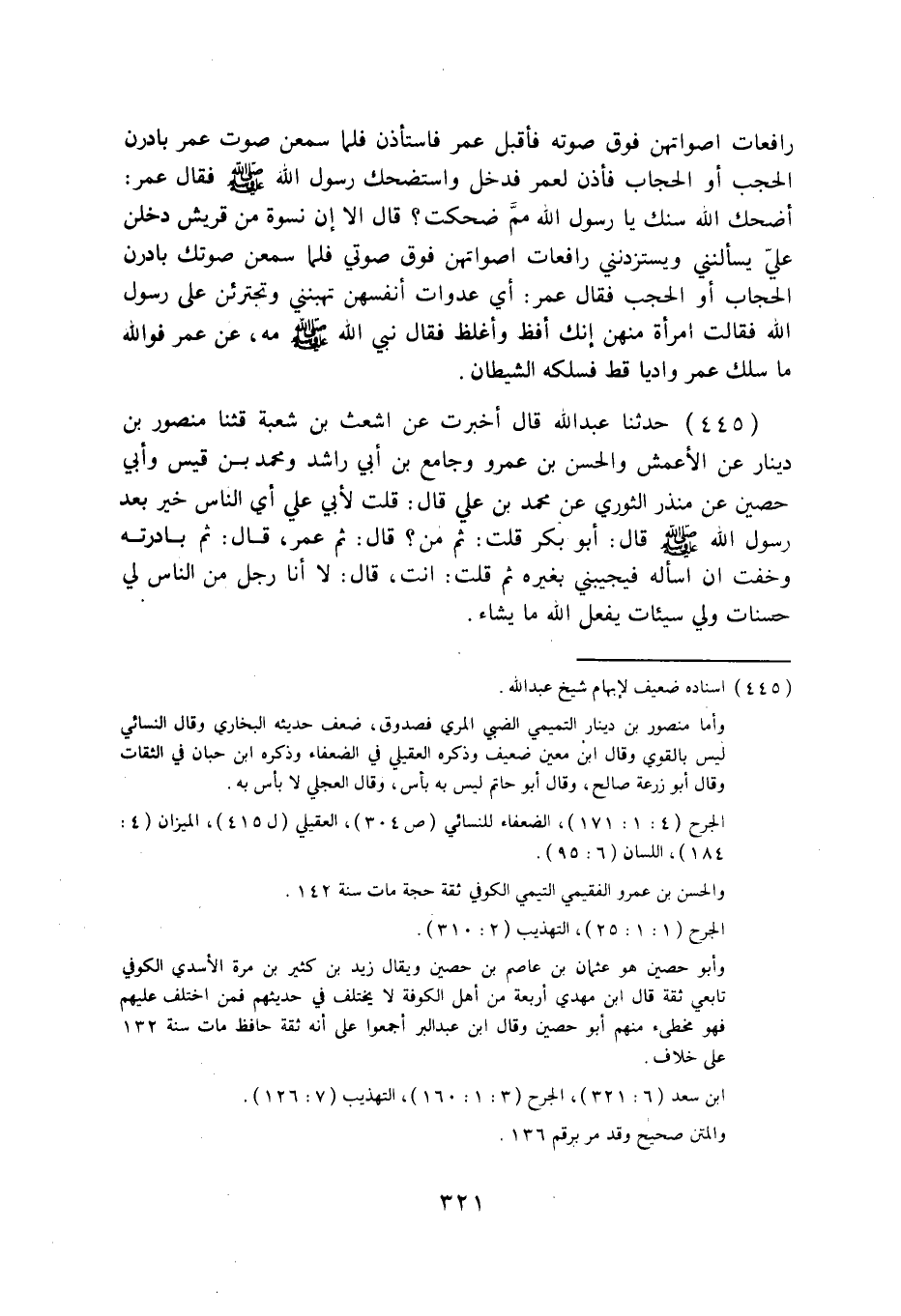 445 - حَدَّثَنَا عَبْدُ اللَّهِ قَالَ: أُخْبِرْتُ عَنْ أَشْعَثَ بْنِ شُعْبَةَ قثنا مَنْصُورُ بْنُ دِينَارٍ، عَنِ الْأَعْمَشِ، وَالْحَسَنِ بْنِ عَمْرٍو، وَجَامَعِ بْنِ أَبِي رَاشِدٍ، وَمُحَمَّدِ بْنِ قَيْسٍ، وَأَبِي حَصِينٍ، عَنْ مُنْذِرٍ الثَّوْرِيِّ، عَنْ مُحَمَّدِ بْنِ عَلِيٍّ قَالَ: قُلْتُ لِأَبِي عَلِيٍّ: §أَيُّ النَّاسِ خَيْرٌ بَعْدَ رَسُولِ اللَّهِ صَلَّى اللهُ عَلَيْهِ وَسَلَّمَ؟ قَالَ: أَبُو بَكْرٍ، قُلْتُ: ثُمَّ مَنْ؟ قَالَ: ثُمَّ عُمَرُ، قَالَ: ثُمَّ بَادَرْتُهُ وَخِفْتُ أَنْ أَسْأَلَهُ فَيُجِيبُنِي بِغَيْرِهِ، ثُمَّ قُلْتُ: أَنْتَ؟ قَالَ: لَا، أَنَا رَجُلٌ مِنَ النَّاسِ لِي حَسَنَاتٌ وَلِي سَيِّئَاتٌ، يَفْعَلُ اللَّهُ مَا يَشَاءُ.