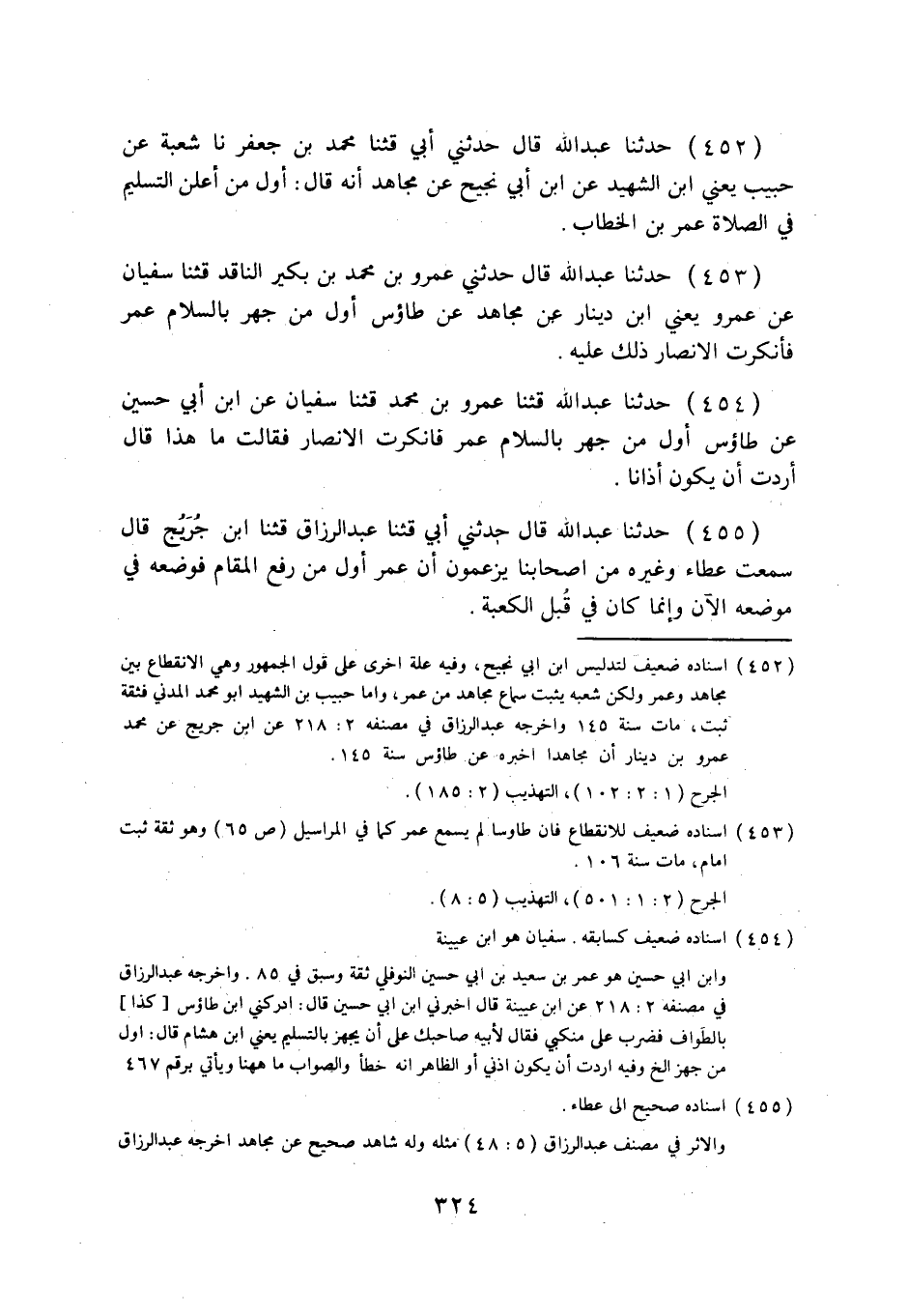 452 - حَدَّثَنَا عَبْدُ اللَّهِ قَالَ: حَدَّثَنِي أَبِي، قثنا مُحَمَّدُ بْنُ جَعْفَرٍ، نا شُعْبَةُ، عَنْ حَبِيبٍ يَعْنِي ابْنَ الشَّهِيدِ، عَنِ ابْنِ أَبِي نَجِيحٍ، عَنْ مُجَاهِدٍ، أَنَّهُ قَالَ: §أَوَّلُ مَنْ أَعْلَنَ التَّسْلِيمَ فِي الصَّلَاةِ عُمَرُ بْنُ الْخَطَّابِ.