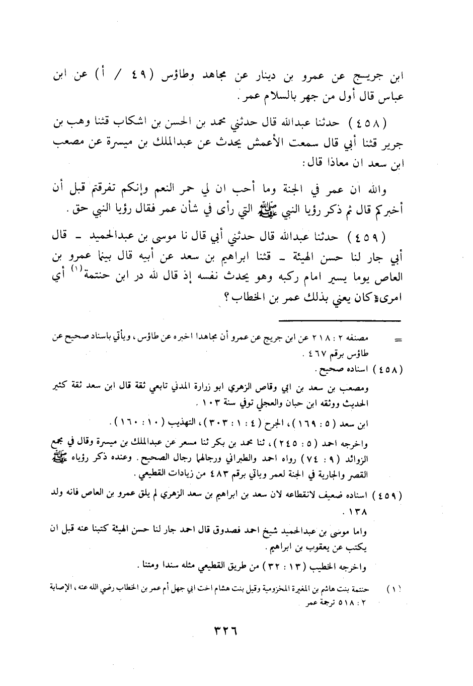 458 - حَدَّثَنَا عَبْدُ اللَّهِ قَالَ: حَدَّثَنِي مُحَمَّدُ بْنُ الْحَسَنِ بْنِ إِشْكَابَ، قثنا وَهْبُ بْنُ جَرِيرٍ قثنا أَبِي قَالَ: سَمِعْتُ الْأَعْمَشَ يُحَدِّثُ، عَنْ عَبْدِ الْمَلِكِ بْنِ مَيْسَرَةَ، عَنْ مُصْعَبِ بْنِ سَعْدٍ، أَنَّ مُعَاذًا قَالَ: وَاللَّهِ، §إِنَّ عُمَرَ فِي الْجَنَّةِ، وَمَا أُحِبُّ أَنَّ لِي حُمْرَ النَّعَمِ، وَإِنَّكُمْ تَفَرَّقْتُمْ قَبْلَ أَنْ أُخْبِرَكُمْ، قَالَ: ثُمَّ ذَكَرَ رُؤْيَا النَّبِيِّ صَلَّى اللهُ عَلَيْهِ وَسَلَّمَ الَّتِي رَأَى فِي شَأْنِ عُمَرَ، فَقَالَ: رُؤْيَا النَّبِيِّ حَقٌّ.