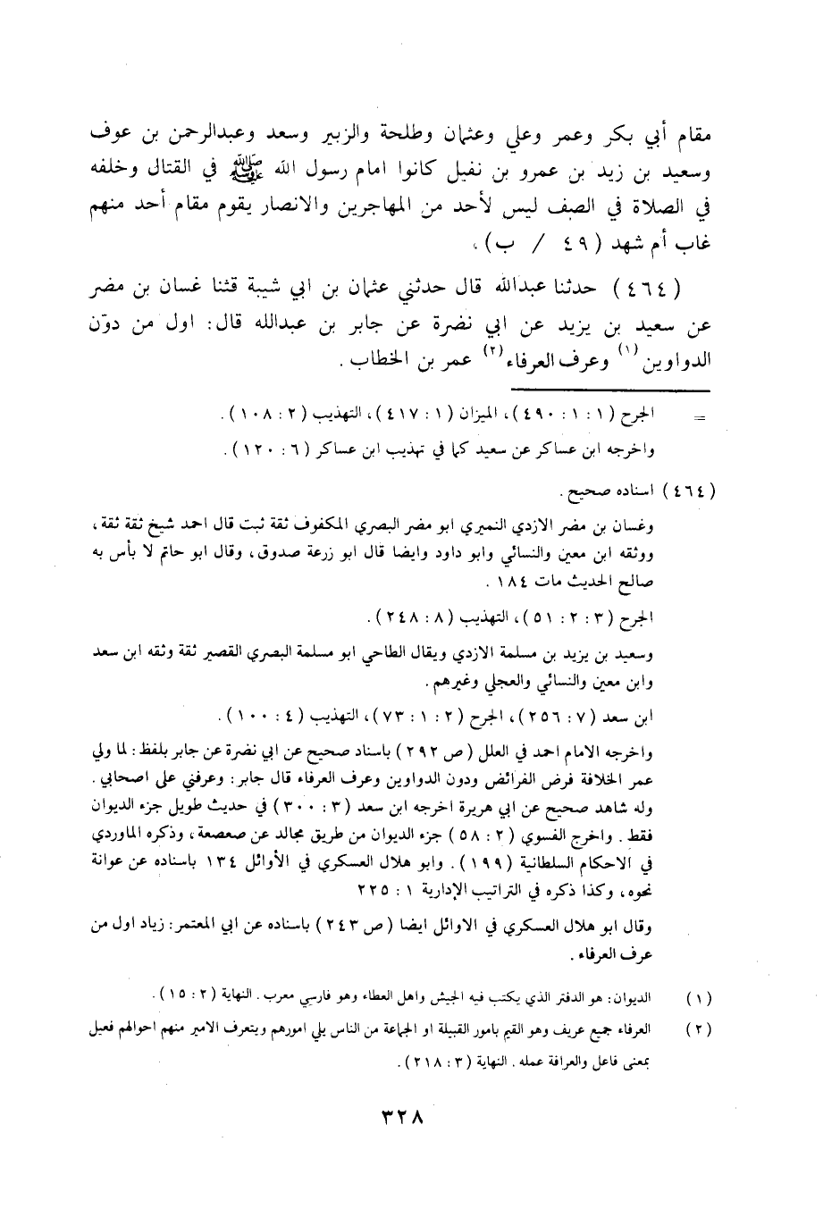 464 - حَدَّثَنَا عَبْدُ اللَّهِ قَالَ: حَدَّثَنِي عُثْمَانُ بْنُ أَبِي شَيْبَةَ قثنا غَسَّانُ بْنُ مُضَرَ، عَنْ سَعِيدِ بْنِ يَزِيدَ، عَنْ أَبِي نَضْرَةَ، عَنْ جَابِرِ بْنِ عَبْدِ اللَّهِ قَالَ: §أَوَّلُ مَنْ دَوَّنَ الدَّوَاوِينَ، وَعَرَفَ الْعُرَفَاءَ عُمَرُ بْنُ الْخَطَّابِ