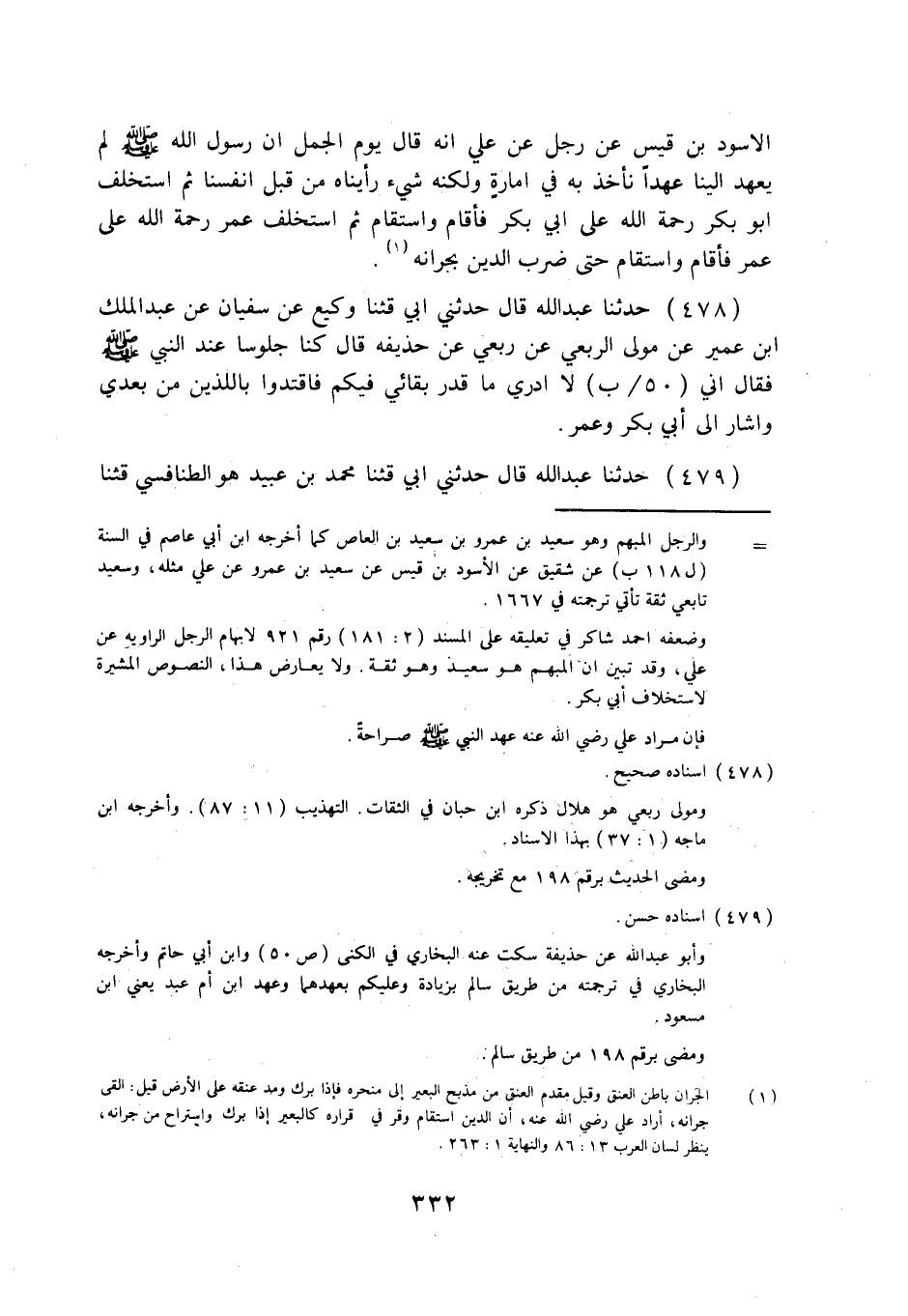 478 - حَدَّثَنَا عَبْدُ اللَّهِ قَالَ: حَدَّثَنِي أَبِي، قثنا وَكِيعٌ، عَنْ سُفْيَانَ، عَنْ عَبْدِ الْمَلِكِ بْنِ عُمَيْرٍ، عَنْ مَوْلَى الرَّبْعِيِّ، عَنْ رِبْعِيٍّ، عَنْ حُذَيْفَةَ قَالَ: كُنَّا جُلُوسًا عِنْدَ النَّبِيِّ صَلَّى اللهُ عَلَيْهِ وَسَلَّمَ فَقَالَ: «إِنِّي لَا أَدْرِي مَا قَدْرُ بَقَائِي فِيكُمْ، §فَاقْتَدُوا بِاللَّذَيْنِ مِنْ بَعْدِي» ، وَأَشَارَ إِلَى أَبِي بَكْرٍ وَعُمَرَ.